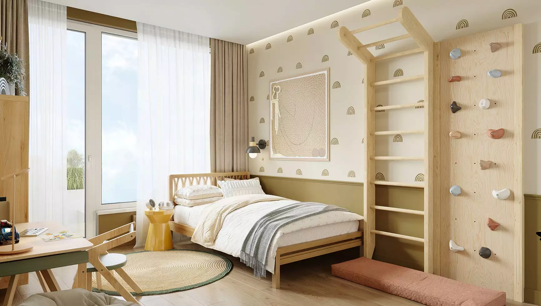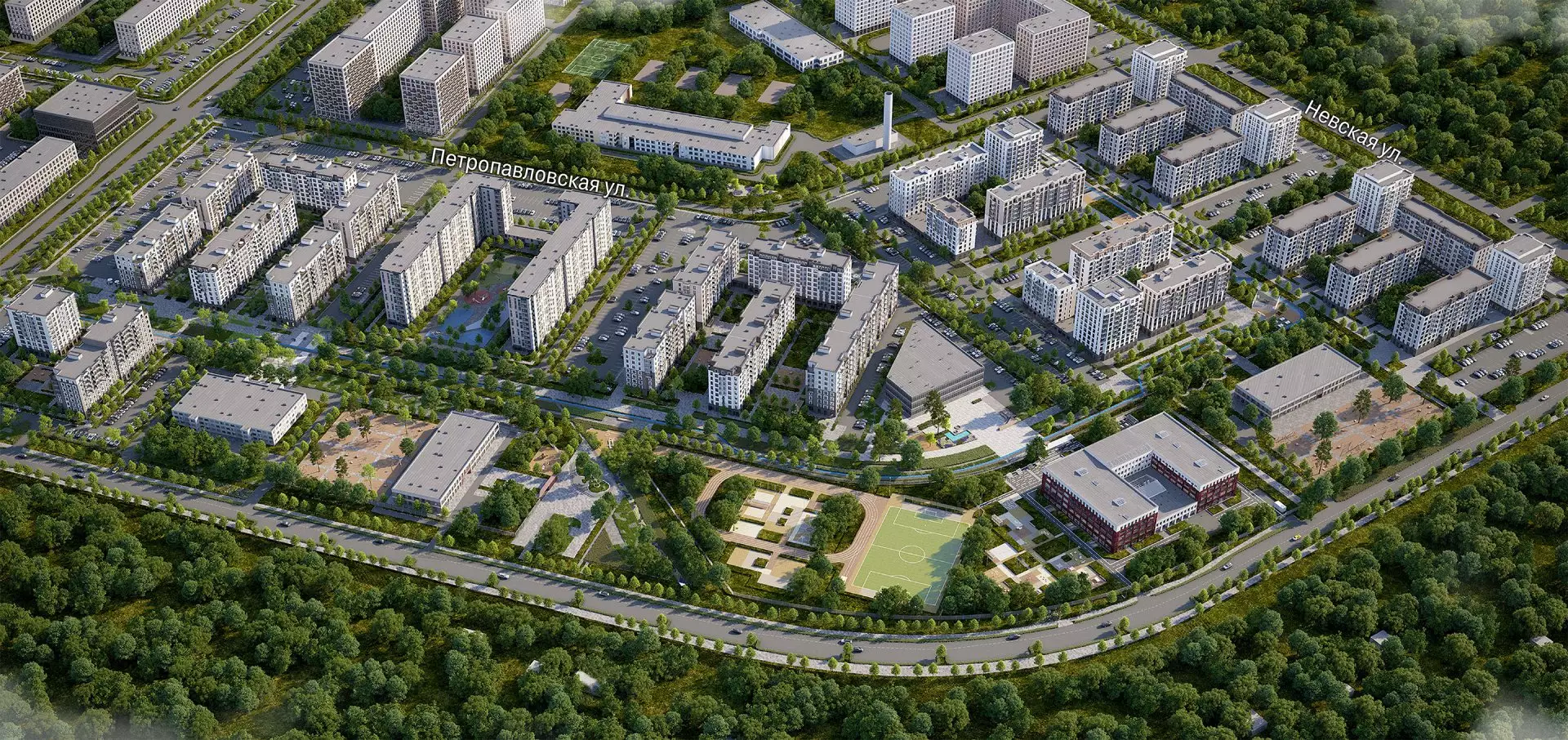 Закрытые тихие дворы, доступные исключительно жителям комплекса, оформлены по экологическим стандартам с обильным озеленением высокими соснами, многоуровневыми кустарниками и злаковыми посадками. Здесь разместятся уютные беседки, площадки для игр в петанк и городки, а также высокие грядки для совместного садоводства. В центре квартала расположится просторная площадь с вечнозеленой елкой, окруженная уютными лавочками. Отсюда берет начало пешеходный бульвар в концепции природного парка, плавно соединяющий жилые корпуса с общественными пространствами и обеспечивающий связь с поселком Новоселье. Это место станет центром притяжения благодаря амфитеатру для мероприятий, детской игровой зоне с сухим фонтаном и кинетической инсталляцией. Зимой пространство преобразится в праздничную площадку с катком. Для активного отдыха рядом с домами предусмотрены многофункциональные спортивные зоны с футбольным и баскетбольным полями, уличными тренажерами и столами для настольного тенниса. Отдельный кластер посвящен йоге и воркауту, дополненный лужайкой для занятий и гриль-станцией. Семейный отдых организован на специальной территории с волейбольной площадкой, детскими игровыми комплексами и зонами отдыха под перголами. Особое внимание уделено развитой сети велодорожек и прогулочных маршрутов, обрамленных живописными яблоневыми аллеями. Дополнительные возможности досуга включают творческие студии для вдохновения на открытом воздухе и специальную площадку для занятий с собаками. В состав встроенной инфраструктуры квартала войдут: