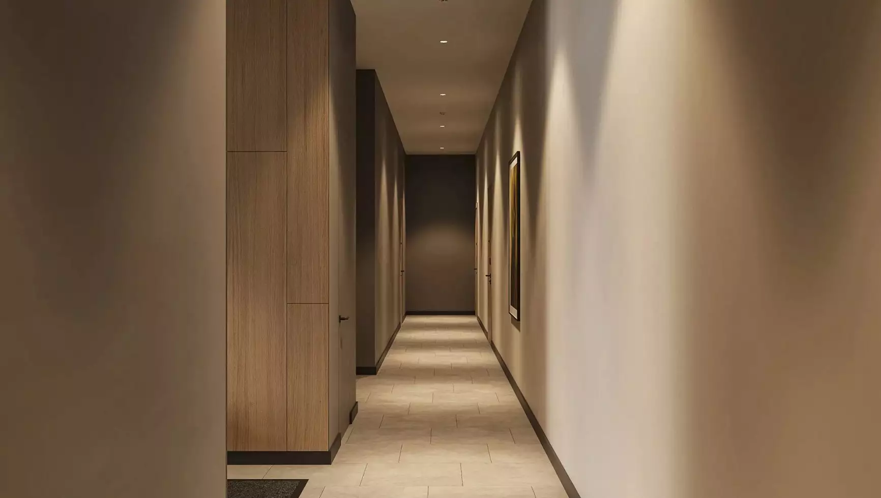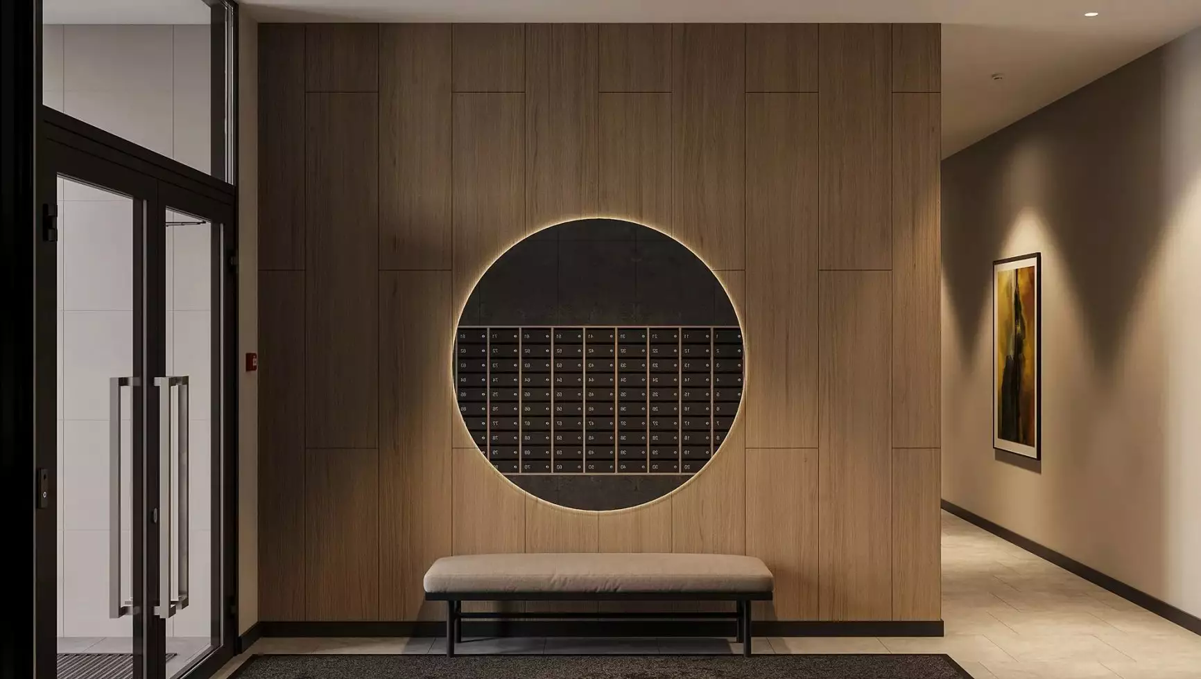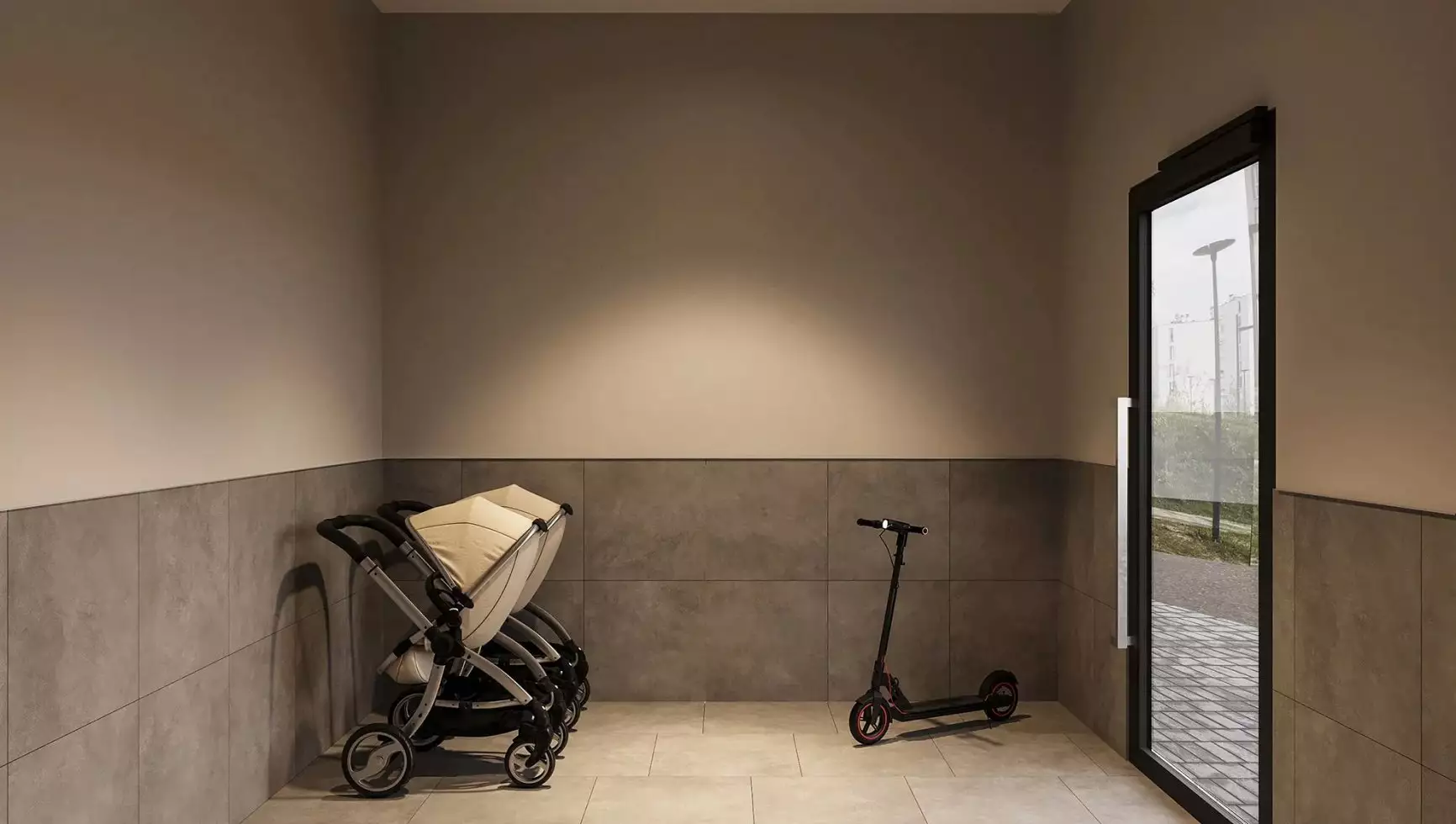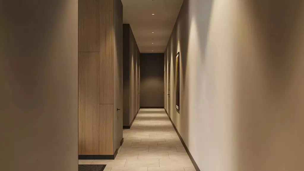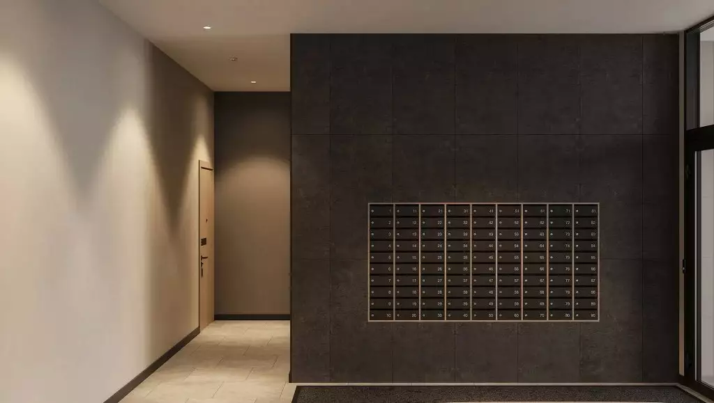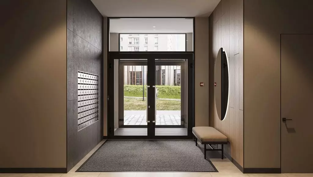 Подъезды комплекса оформлены прозрачными входными дверями, установленными вровень с землёй. Домофоны разместят в защищённых от непогоды тамбурах. Некоторые подъезды сделают проходными, соединяя улицу с территорией внутреннего двора. Архитектурное решение входных групп предусматривает их небольшое углубление относительно фасада, что визуально выделяет коммерческие и общественные пространства. В дизайнерских холлах создадут уютные зоны с почтовыми ящиками и местами для отдыха. Для хранения велосипедов, колясок и самокатов предусмотрены специальные помещения. Цветовая палитра интерьеров перекликается с фасадными решениями, поддерживая единый стиль. Общественные пространства оформят с особым вниманием к деталям: здесь появятся зелёные растения, произведения изобразительного искусства, комфортная мебель и декоративные зеркала с мягкой подсветкой. На первом этаже также расположатся магазины и сервисы, а на подземном уровне — кладовые помещения площадью от 2 до 6 м² для хранения сезонных предметов.