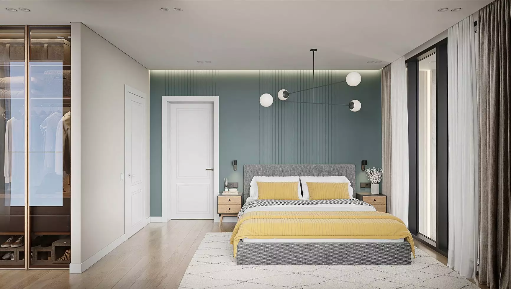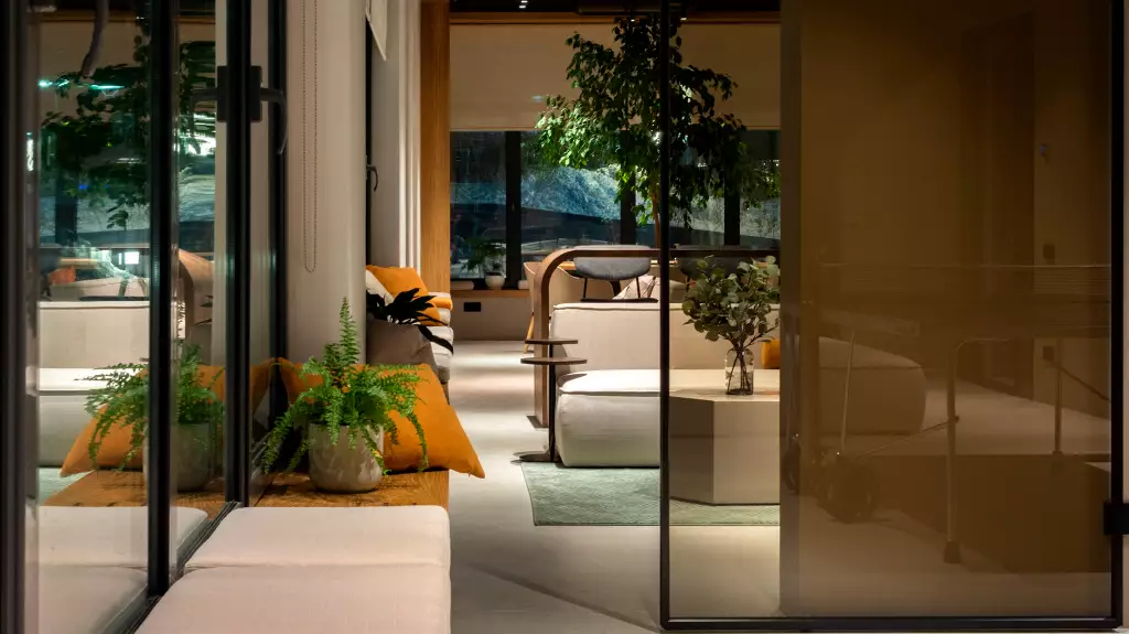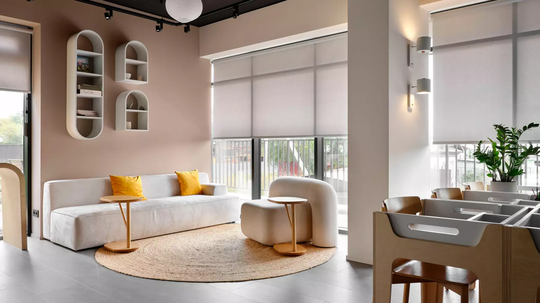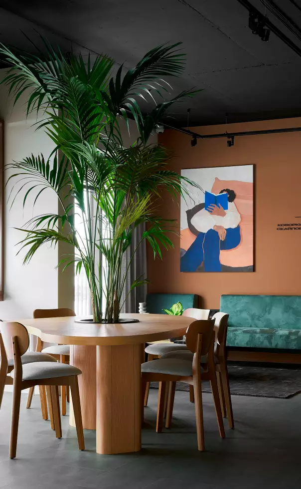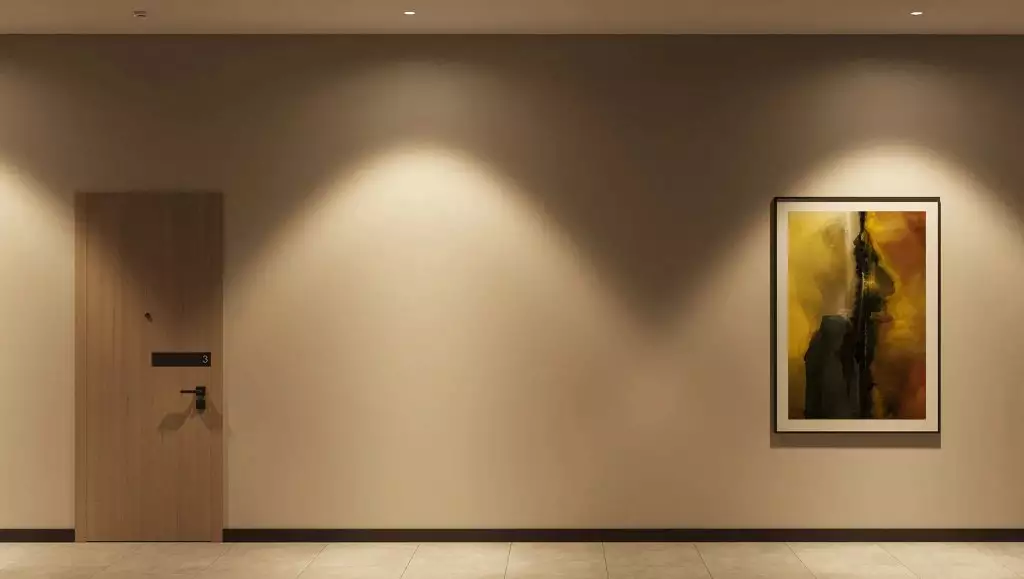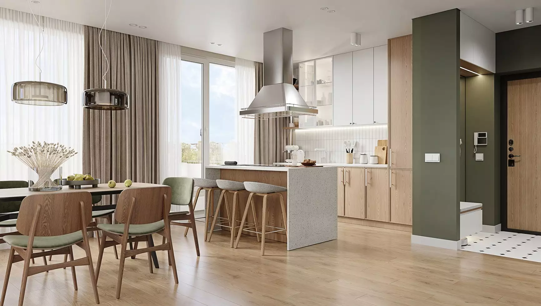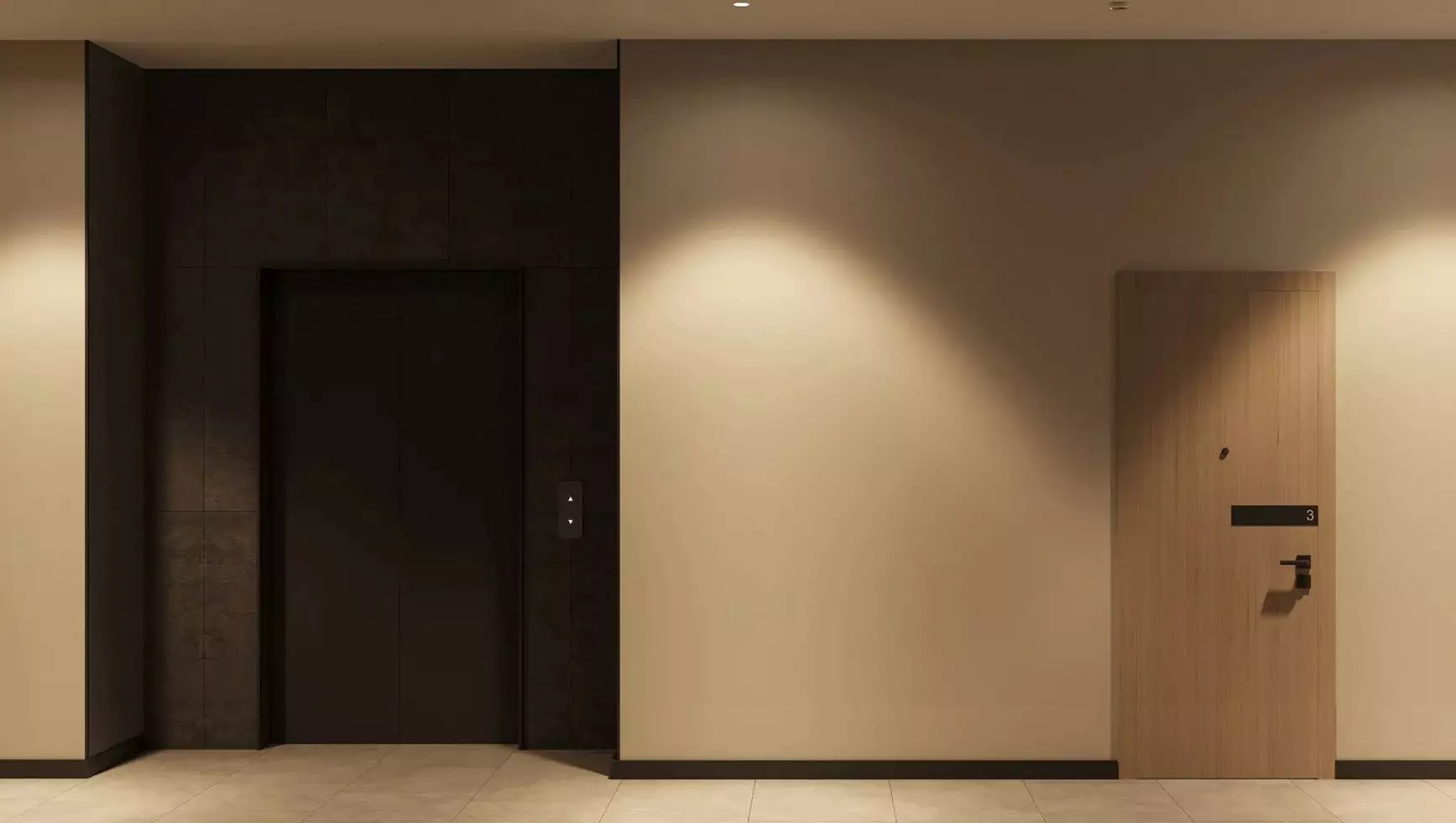 Подъезды комплекса оформлены прозрачными входными дверями, установленными вровень с землёй. Домофоны разместят в защищённых от непогоды тамбурах. Некоторые подъезды сделают проходными, соединяя улицу с территорией внутреннего двора. Архитектурное решение входных групп предусматривает их небольшое углубление относительно фасада, что визуально выделяет коммерческие и общественные пространства. В дизайнерских холлах создадут уютные зоны с почтовыми ящиками и местами для отдыха. Для хранения велосипедов, колясок и самокатов предусмотрены специальные помещения. Цветовая палитра интерьеров перекликается с фасадными решениями, поддерживая единый стиль. Общественные пространства оформят с особым вниманием к деталям: здесь появятся зелёные растения, произведения изобразительного искусства, комфортная мебель и декоративные зеркала с мягкой подсветкой. На первом этаже также расположатся магазины и сервисы, а на подземном уровне — кладовые помещения площадью от 2 до 6 м² для хранения сезонных предметов.