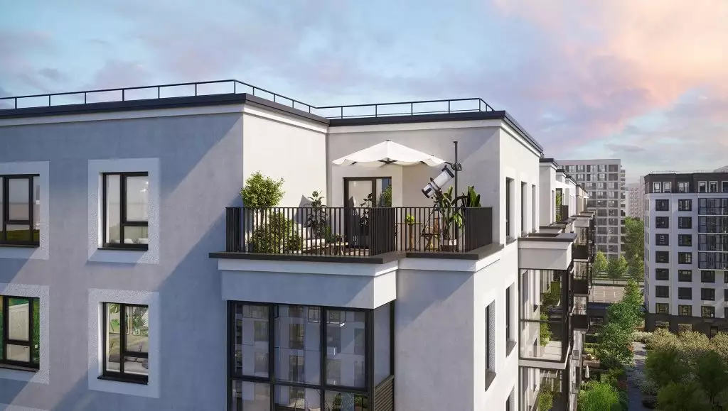 Покупателям предлагаются разнообразные варианты квартир — от компактных студий до просторных трёхкомнатных. Стандартная высота потолков составляет 2,7 м. На первых и последних этажах этот параметр увеличен до 2,82 м. Все помещения отличаются продуманной геометрией и чётким зонированием: дневная зона объединяет просторную кухню-столовую и гостиную, а спальная часть расположена отдельно. В просторных квартирах предусмотрены мастер-спальни с гардеробными и отдельными санузлами. Некоторые планировки включают кабинеты для работы. Квартиры с 5 по 8 этажи оборудованы остеклёнными балконами. Эксклюзивные лоты на последних этажах дополнены приватными террасами, открывающими панорамные виды. Наземные террасы окружены живой изгородью, создавая уединённые зоны для отдыха. Все лоты передаются застройщиком с предчистовой отделкой.