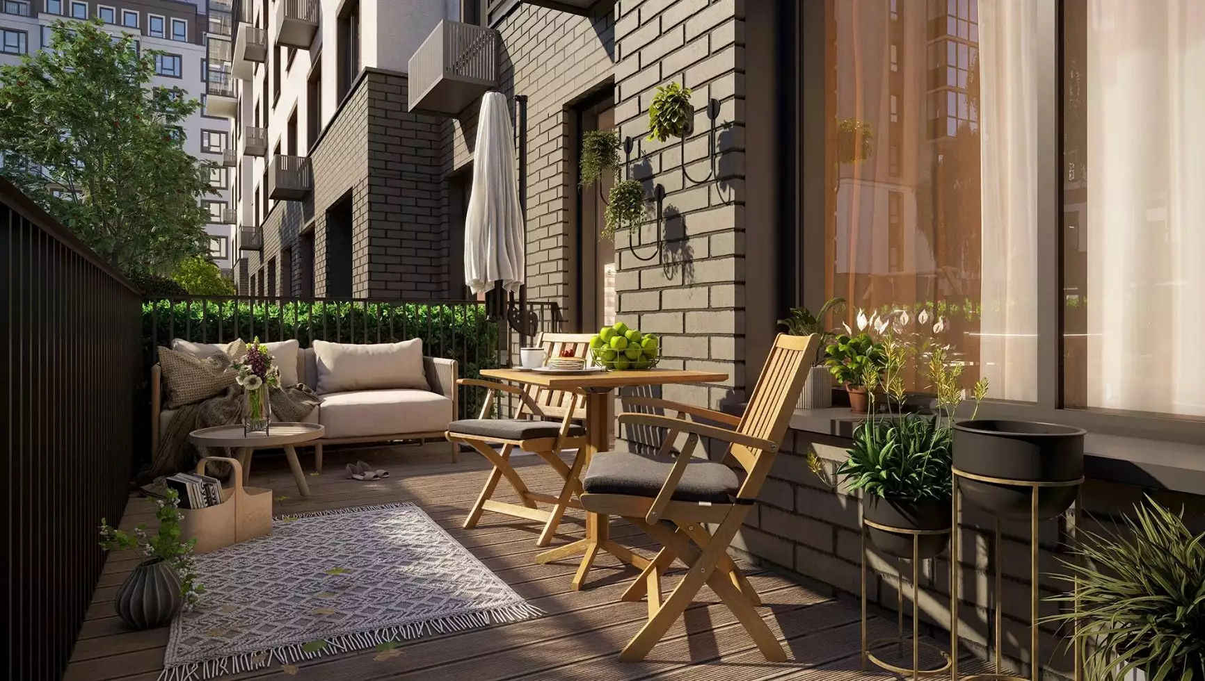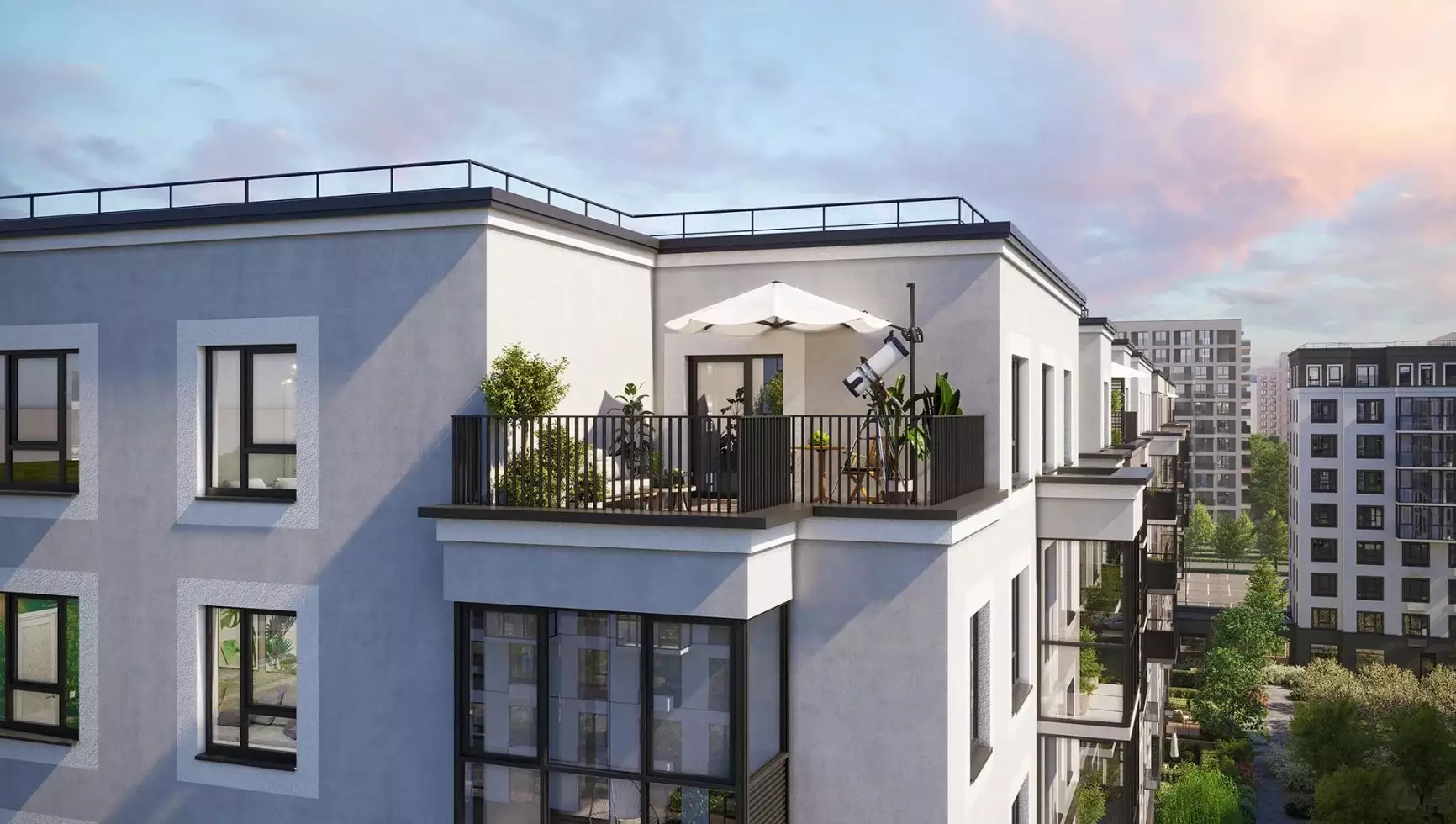 Проект новостройки отличается строгими формами и продуманными деталями. Архитекторы создали несколько вариантов фасадов, объединённых общим принципом — сочетанием вертикальных и горизонтальных линий. Такой эффект достигнут благодаря ритмичному расположению балконов, различиям в этажности и цветовым акцентам. Фасады приобретают выразительность за счёт симметричных композиций и декоративных элементов. Отделка стен решена в естественной цветовой гамме с использованием материалов, имитирующих натуральные фактуры. Нижние этажи украсит плитка под клинкерный кирпич. Окна обрамлены изящными наличниками, подчёркивающими геометрию зданий. Балконы оборудованы лёгким витражным остеклением с полупрозрачными панелями в нижней части. Особенность комплекса — разнообразные террасы. Они расположены на разных уровнях: первые этажи, верхние ярусы, угловые секции. Каждая терраса имеет уникальную форму, но все они выполняют важную функцию — соединяют внутреннее пространство квартир с окружающей природой. Одновременно террасы создают выразительные архитектурные акценты, завершая облик зданий.