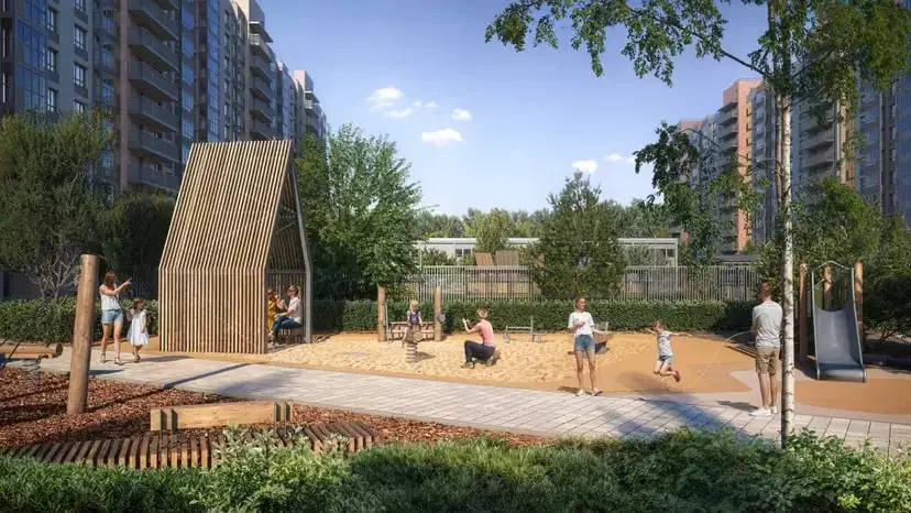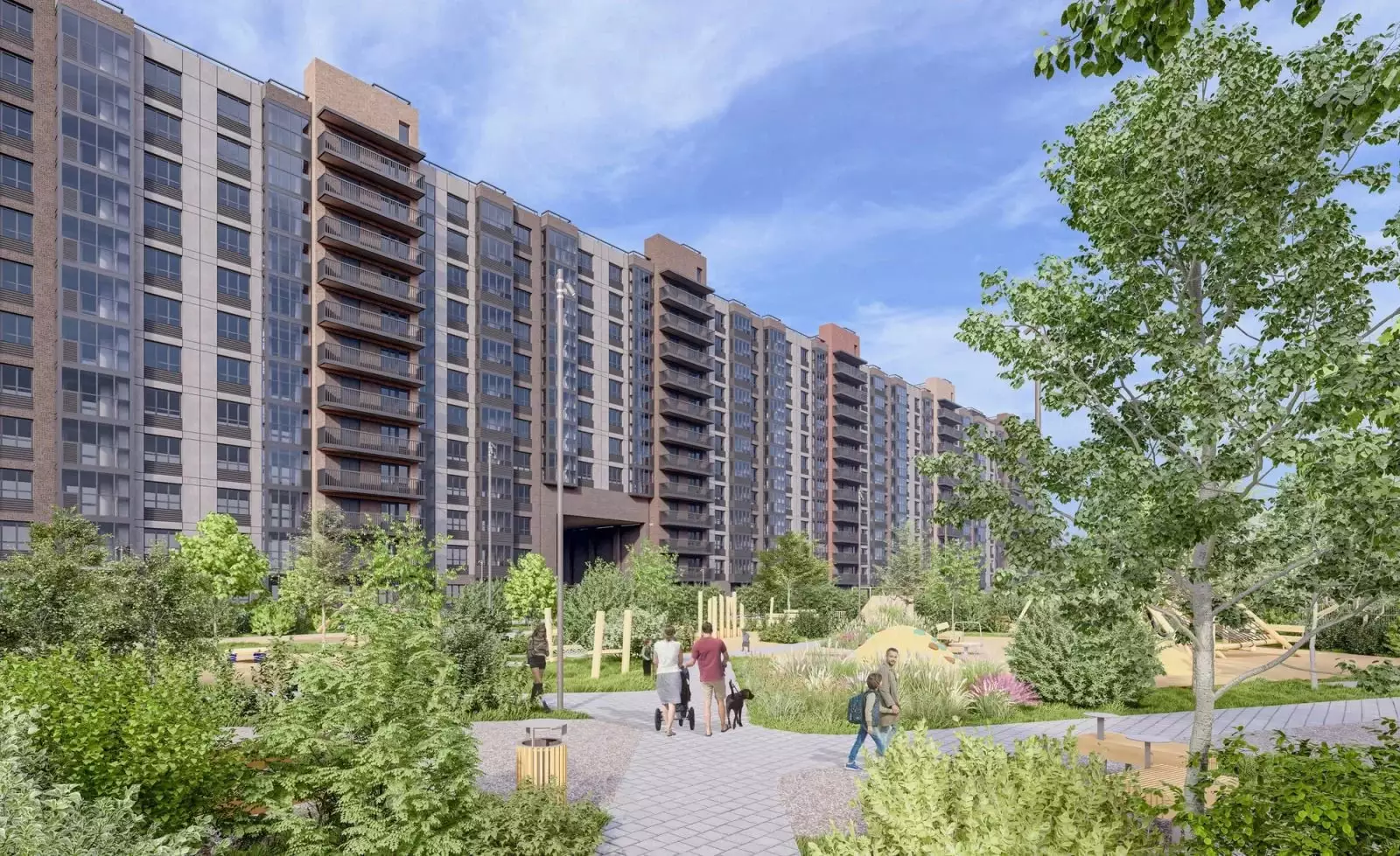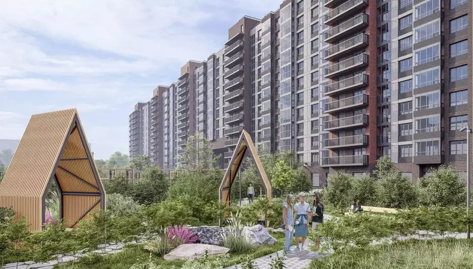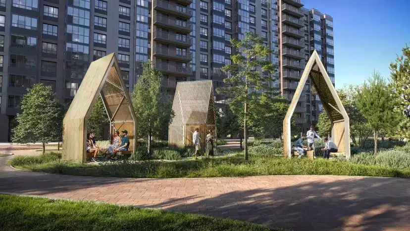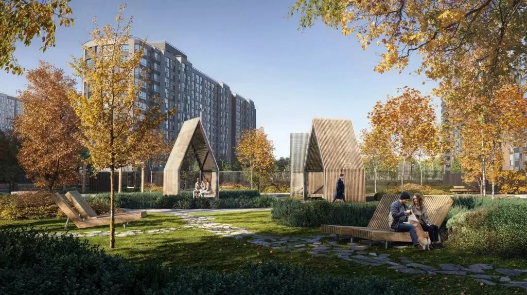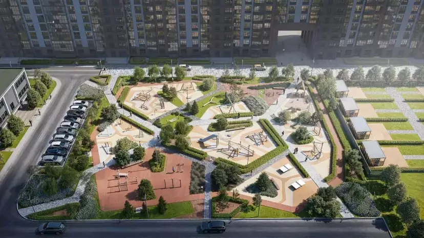 Дворы комплекса сделают уютными и зелёными. Для уединённого отдыха в лаунж-зоне установят гамаки, шезлонги, беседки, удобные скамейки, стол для игры в пинг-понг. Пространство озеленят клёнами, елями, соснами, черёмухой и цветущими кустарниками, подобранными так, чтобы двор оставался красивым в любое время года. Разновозрастные детские площадки оснастят горками, песочницами и качелями, а для активного досуга оборудуют спортивные уголки с тренажёрами и турниками, выделят лужайку для йоги. Различные зоны во дворе разделят живые изгороди. В состав встроенной инфраструктуры квартала войдут: