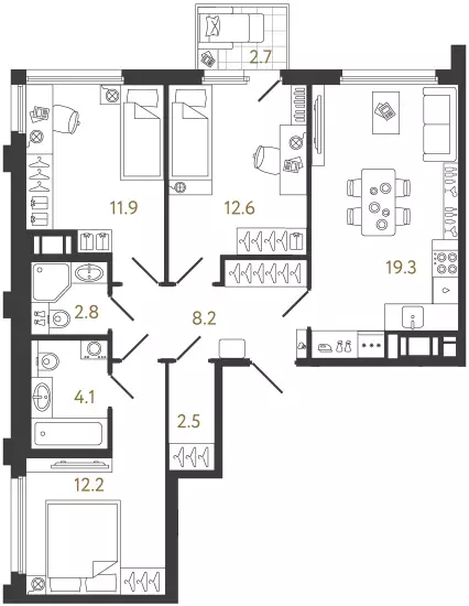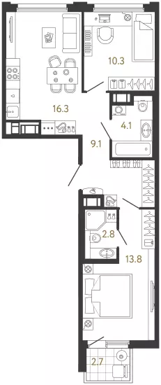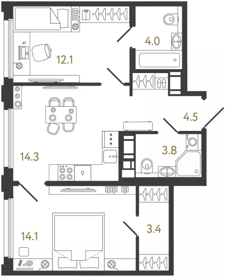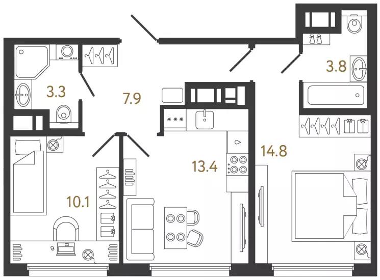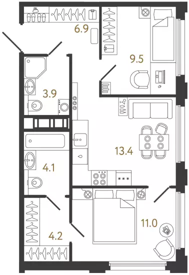 В проекте представлены квартиры разных форматов — от компактных студий до просторных еврочетырёхкомнатных. Все лоты передаются застройщиком с предчистовой отделкой White Box. Площади варьируются от 23 до 85,5 м². Высота потолков в стандартных квартирах составляет 2,73 м. Покупателям доступны планировки с кухнями-гостиными, мастер-спальнями и несколькими санузлами. Во многих квартирах предусмотрены отдельные гардеробные. Особое внимание уделено эксклюзивным вариантам. В продаже есть квартиры с эркерами, остеклёнными лоджиями и террасами площадью почти 13 м², а на верхних этажах расположены high flats с потолками высотой 3 м. Из окон таких лотов открываются виды на Неву и окружающие парки.