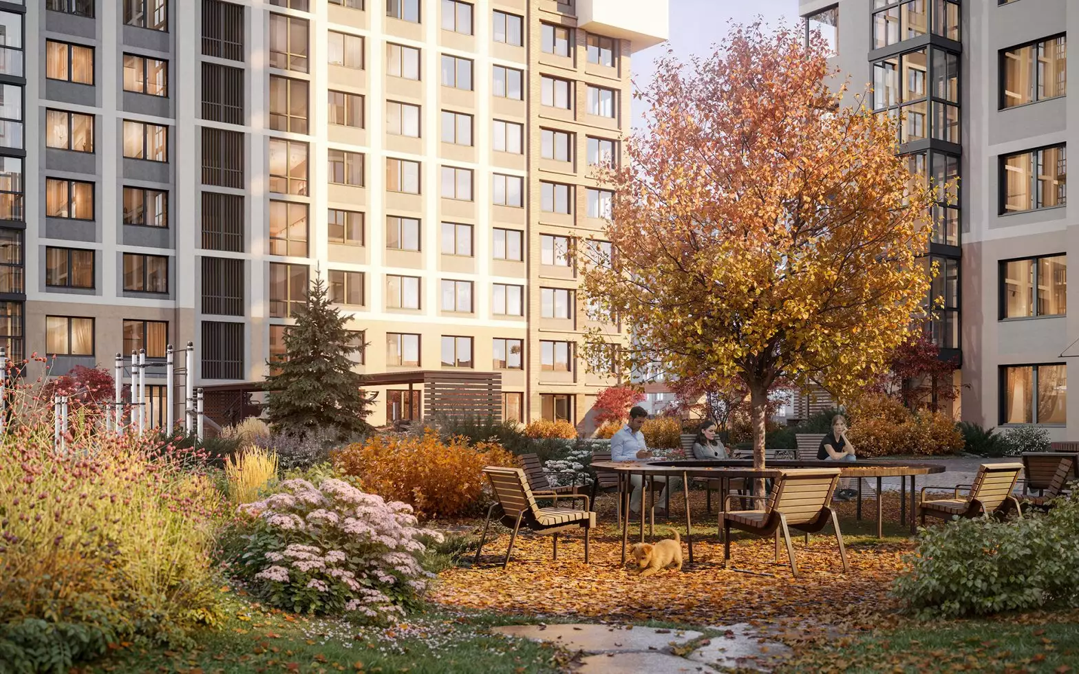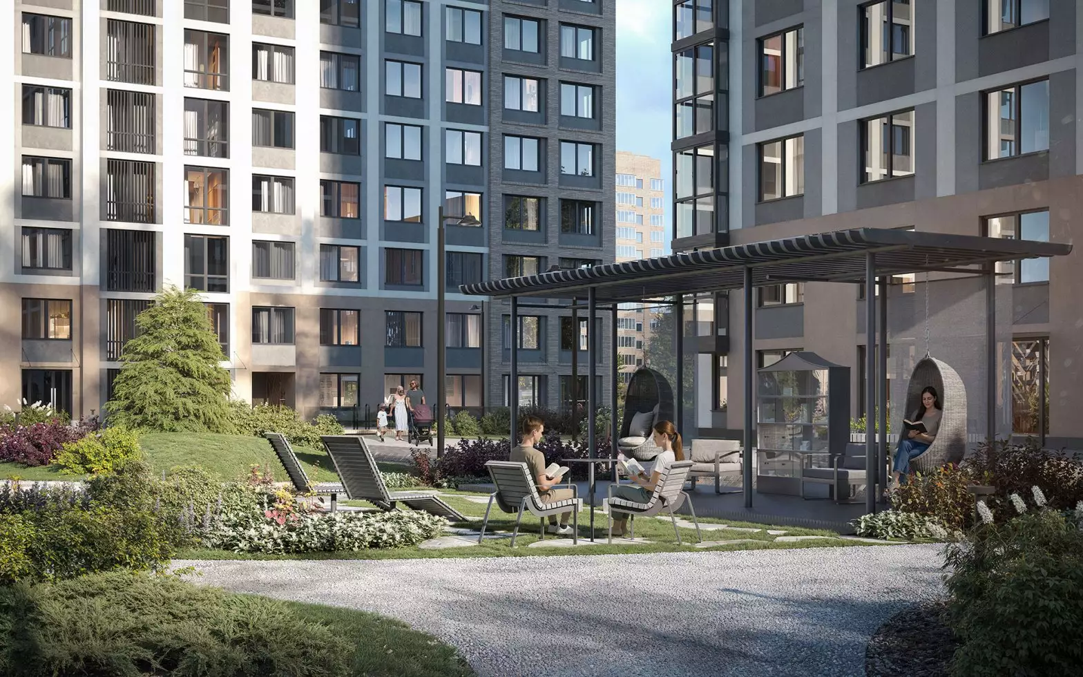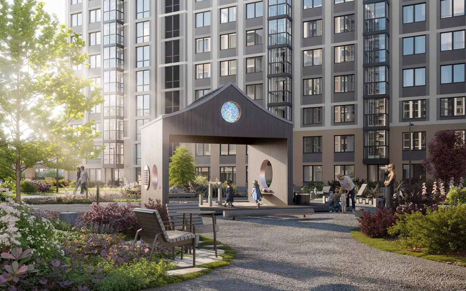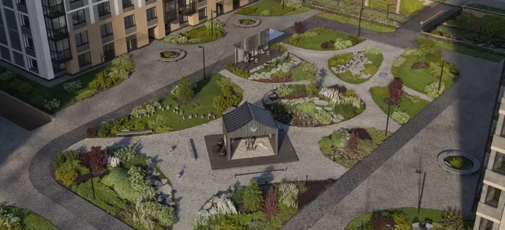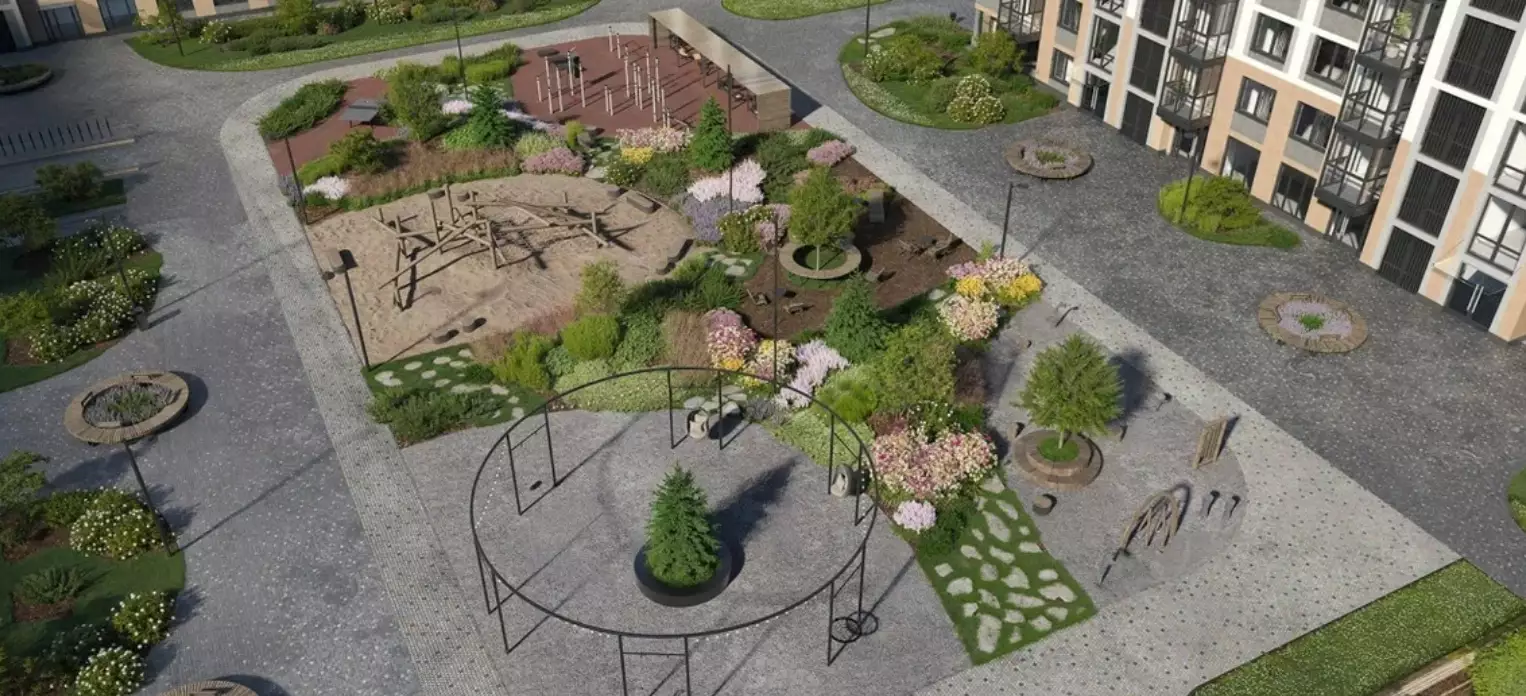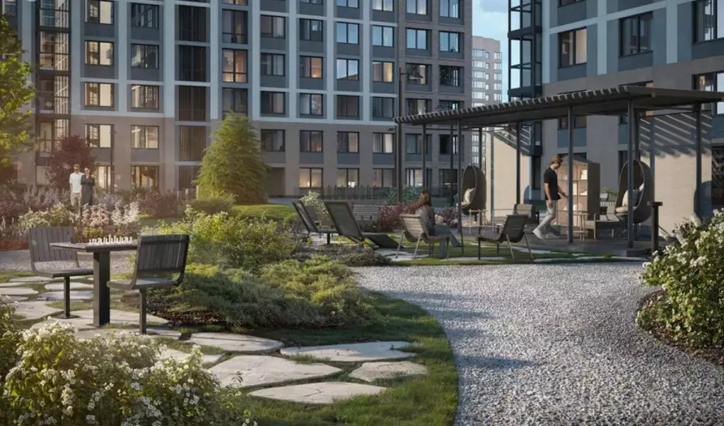 В каждой очереди предусмотрен свой собственный приватный двор. Он расположится на стилобате на уровне второго этажа. Его пространство разделено на две части: "интровертную" и "экстравертную". В тихой озелененной части жители смогут уединиться и отдохнуть в зеленых кабинетах с шезлонгами, гамаками и авторскими арт-объектами среди цветущих деревьев. Здесь же разместится библио-беседка с буккроссингом. В активной зоне экстраверты найдут площадку для комьюнити-активностей. Здесь планируется уличный коворкинг с круглым столом, а также спортивные зоны с профессиональными outdoor-тренажерами и степ-платформами. По тому же двухчастному принципу организованы детские игровые площадки, разработанные АФА х Richter RUS. В одной части, которая посвящена созидательному отдыху, появится библиотека "Эрудит" со сценой для выступлений. Здесь же расположат домик "Мечтатели" с просторной песочницей, балансирующими бревнами и витражным окном. В другой части, отражающей энергию экстраверсии, будут сразу три игровых зоны. Первая — "Головоломка" с лазательным лабиринтом. Вторая — "Волна" с музыкальным игровым оборудованием и переговорными трубами. Третья — "Вращение" с большой качелей.