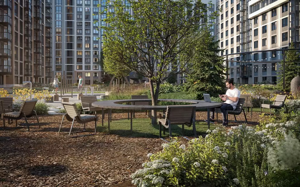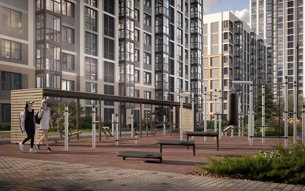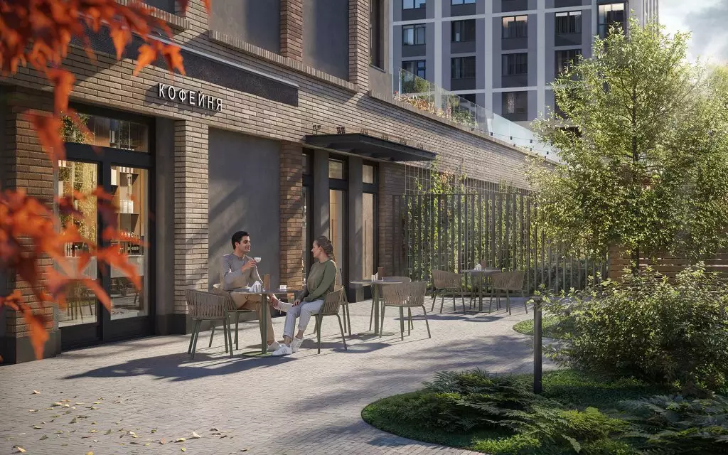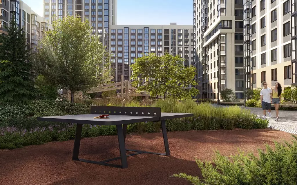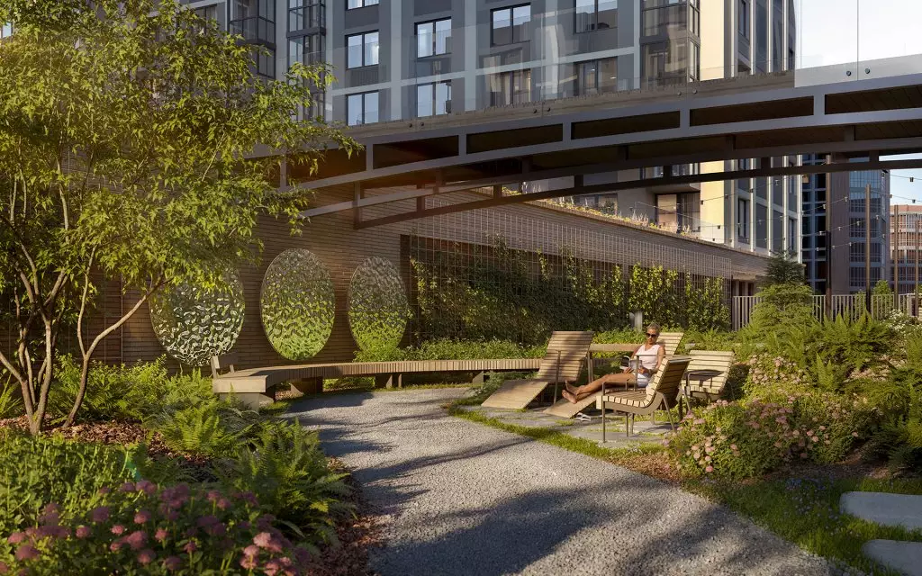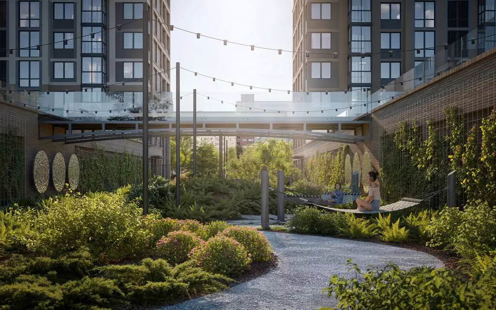 Дворы двух очередей соединит пешеходный мост. Под ним расположат зеленый бульвар-променад, который станет местом для прогулок и отдыха. Здесь можно будет полежать в гамаке, понежиться на солнце, полюбоваться зеркальными инсталляциями и устроить семейный пикник в бранч-зоне под навесом. По проекту дворовое пространство полностью освобождено от машин. Для безопасности предусмотрена круглосуточная охрана и система видеонаблюдения. Попасть во дворы смогут только жители по индивидуальному цифровому ключу. Помимо прочего, в состав встроенной инфраструктуры квартала войдут: