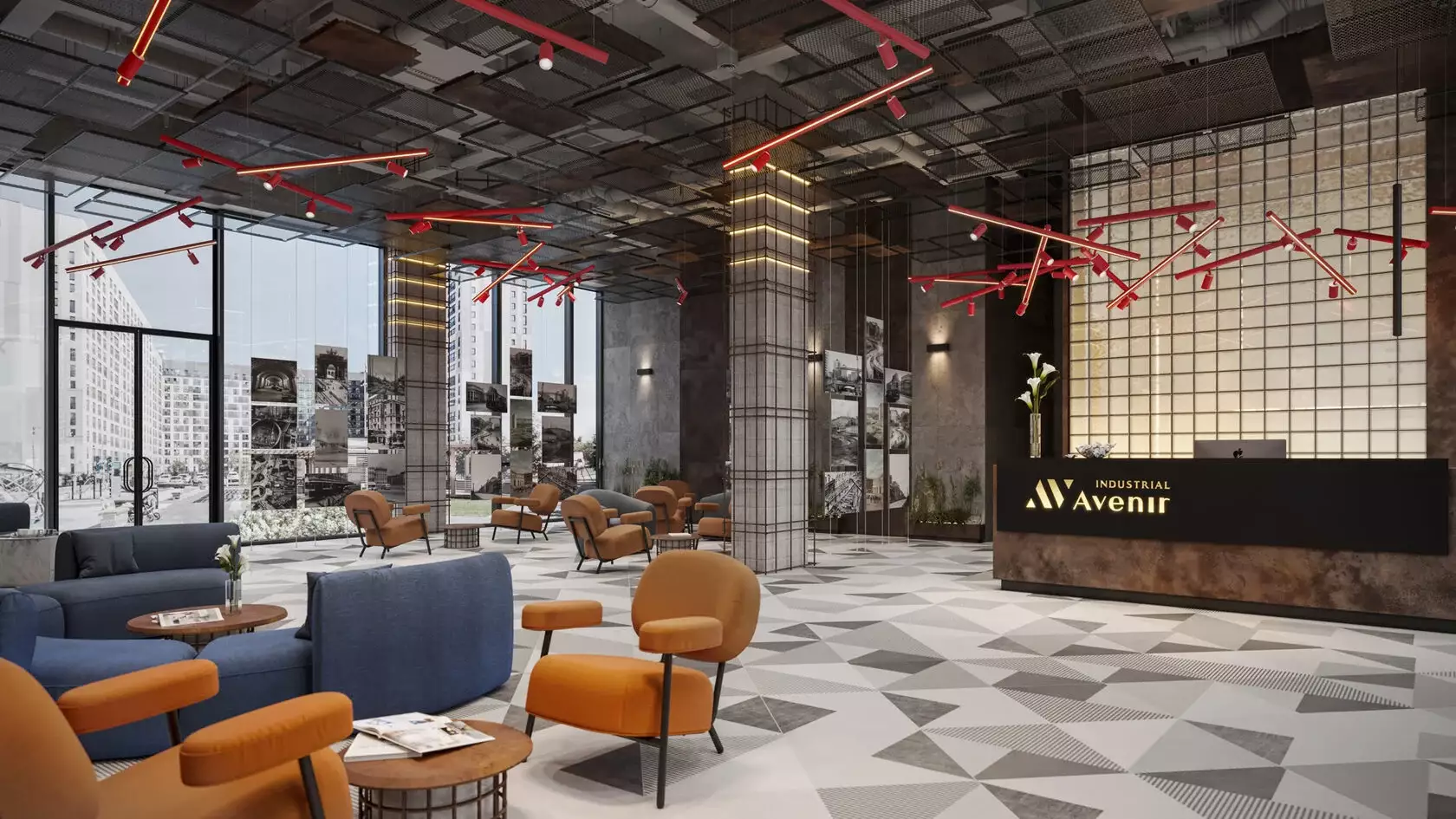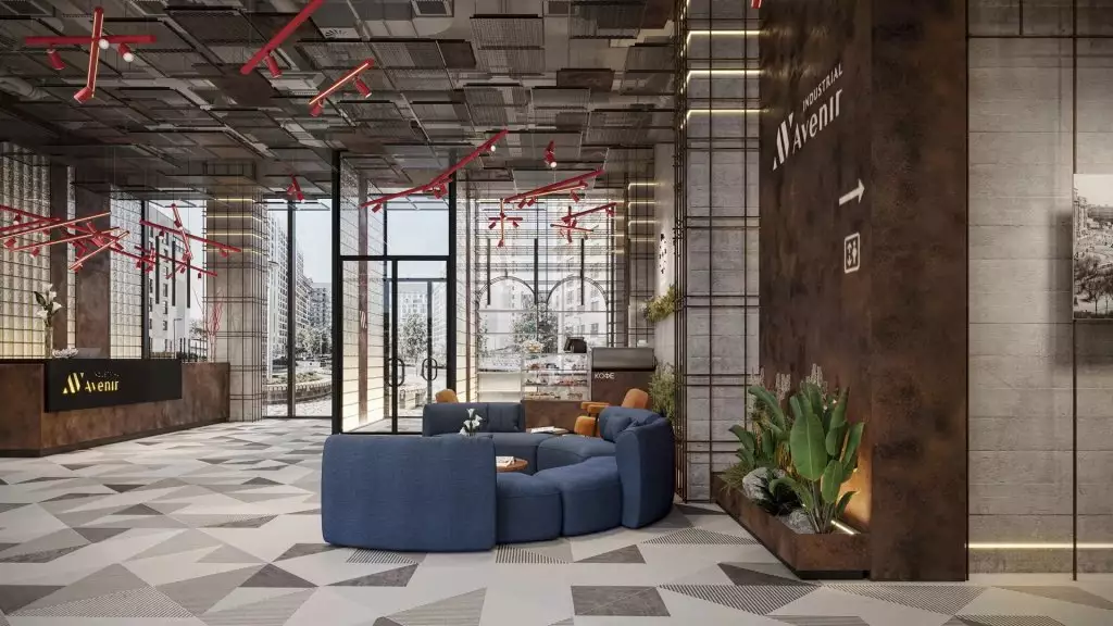 Внутренние пространства Industrial Avenir продолжают индустриальную стилистику экстерьера. Основное общественное пространство — это просторное лобби площадью 160 м², где размещены стойка ресепшн с круглосуточным консьерж-сервисом, зона отдыха с мягкой мебелью и зелеными растениями, кофе-бар и выставочная зона. Высокие потолки и окна в пол создают ощущение простора, а характерные для индустриального стиля детали, такие как декоративные бетонные поверхности, колонны, имитирующие арматуру, перегородки из стеклоблоков и промышленные светильники, придают интерьеру уникальный характер. Для резидентов на 13-м этаже предусмотрено трансформируемое пространство в формате коворкинга с рабочими зонами, кухней, проектором и местами для отдыха. Этот этаж можно использовать как для работы, так и для проведения встреч. Первые этажи комплекса предназначены для коммерческих помещений, а подземный уровень — для паркинга, рассчитанного примерно на 80 машино-мест.