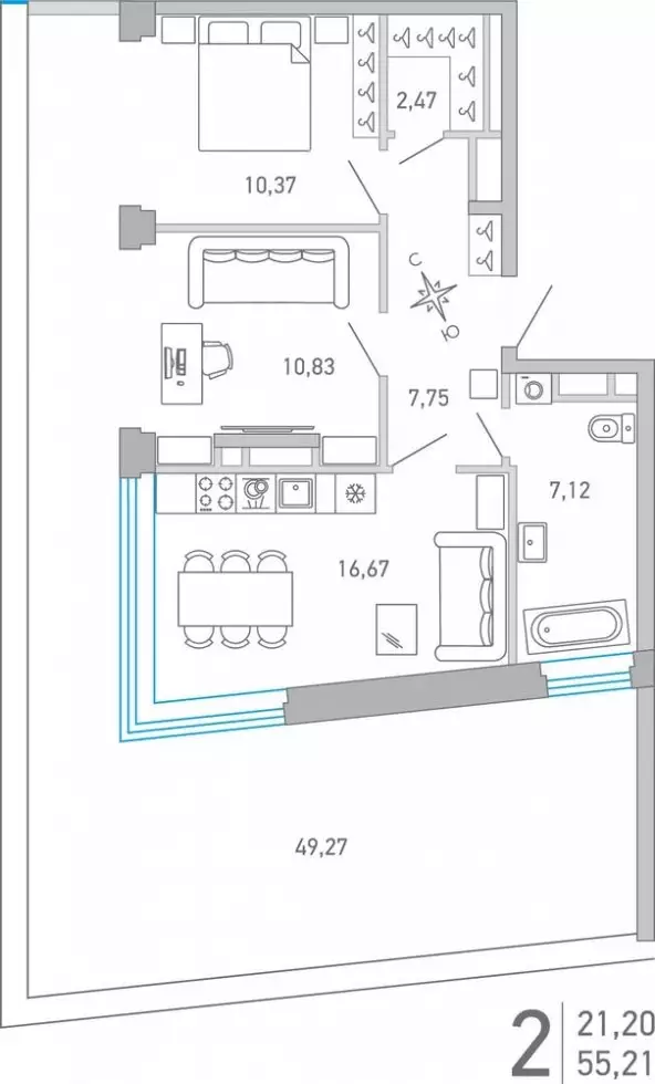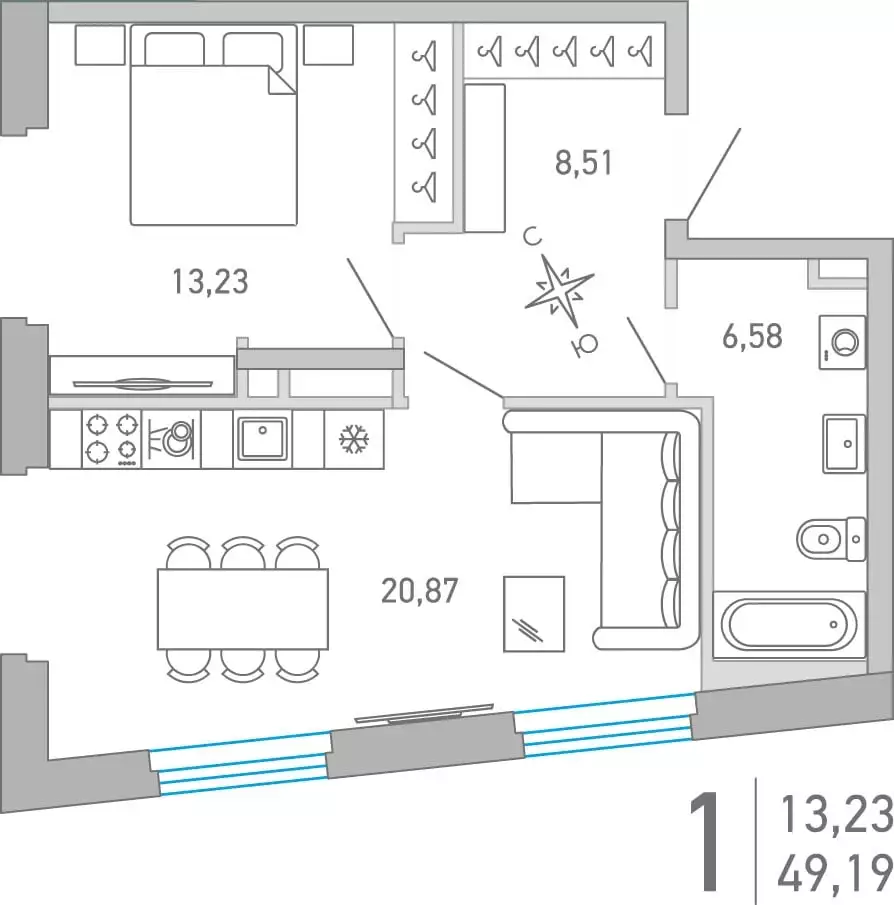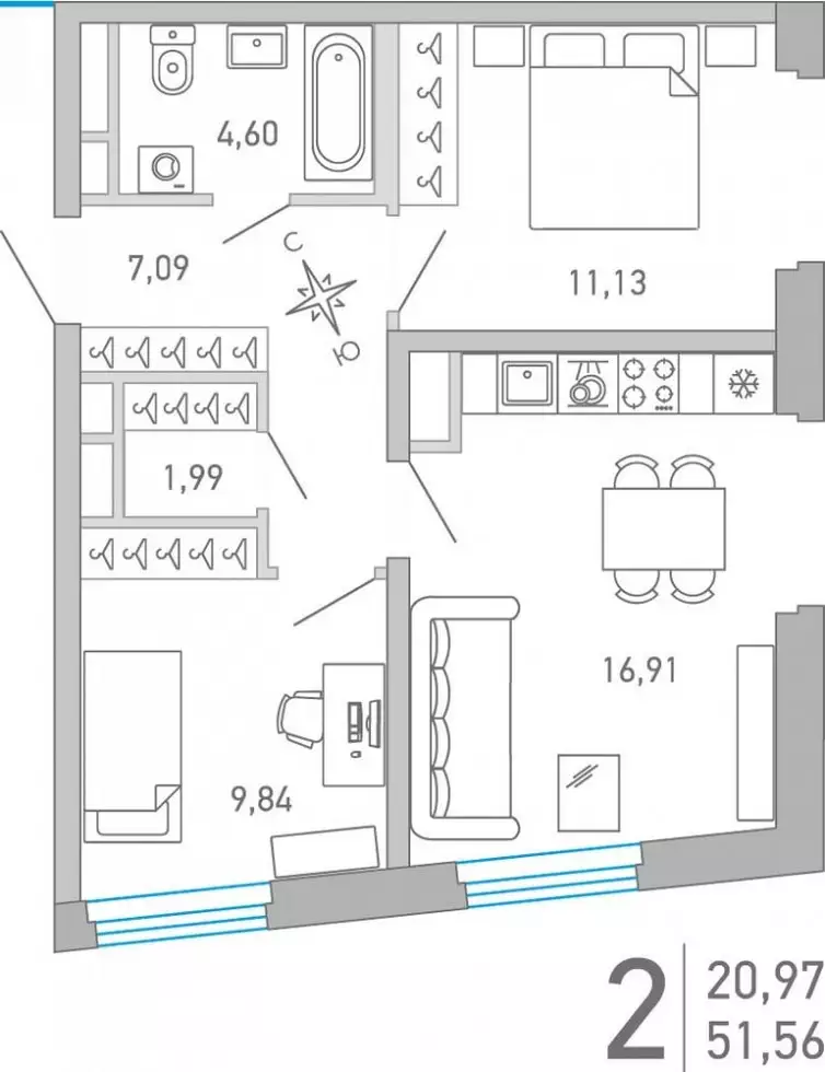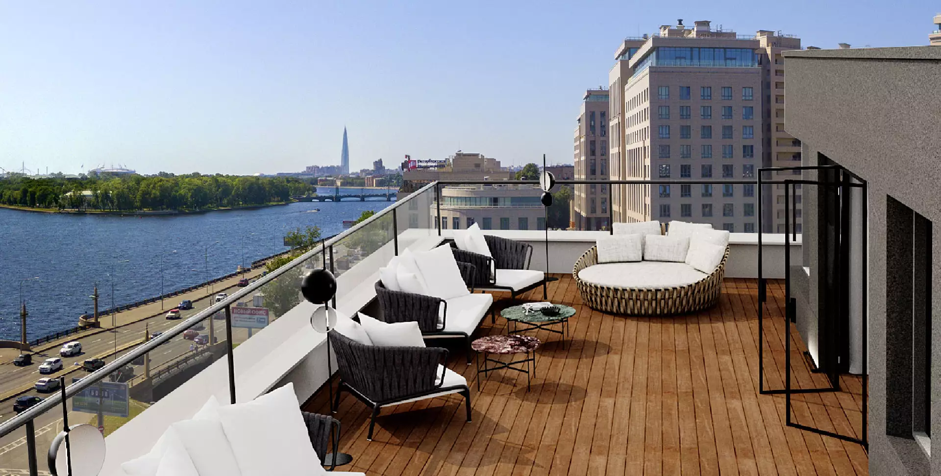Покупателям предлагаются разнообразные варианты планировок площадью от 35 до 102 м² с потолками от 2,7 м на типовом этаже и с числом спален от одной до трех. На последнем этаже расположены эксклюзивные пентхаусы с потолками высотой 3,65 м и террасами. Также доступны лоты с отдельным входом и патио на первом этаже, угловым остеклением Grand View, мастер-спальней, окном в ванной комнате. Все квартиры оснащены гардеробными помещениями, а "двушки" и "трешки" имеют два санузла. Застройщик передает жилье без отделки, а также с предчистовой отделкой. Расположение на пересечении набережной Черной речки и набережной Невы обеспечивает большинству квартир великолепные виды. Окна будут выходить на Каменный остров и Петроградскую сторону, предлагая захватывающие виды на слияние рек, зеленые парки Каменного, Крестовского и Елагина островов, а также на Лопухинский и Ботанический сад. Вдали виднеется шпиль телебашни и, при ясной погоде, Финский залив.