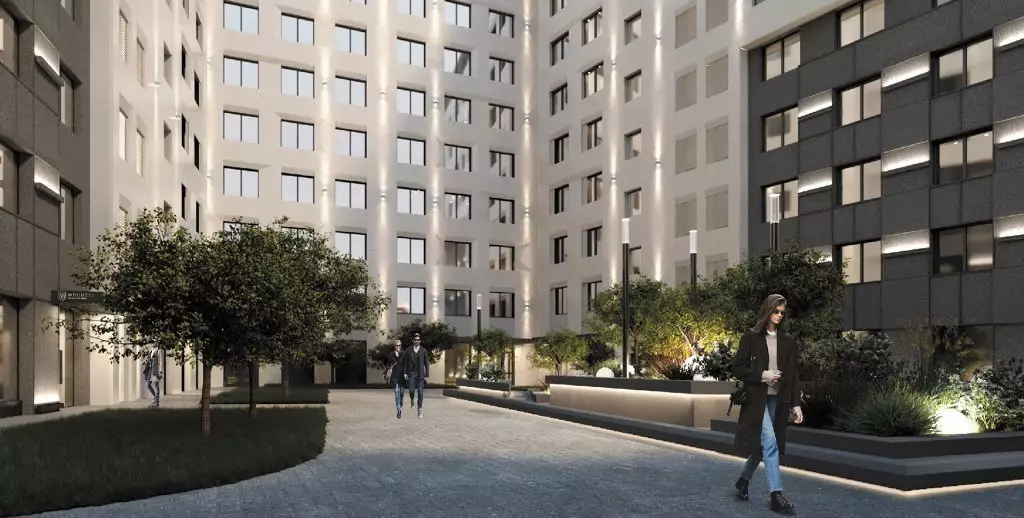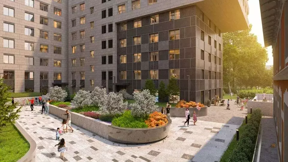 Внутренний двор комплекса, хотя и небольшой по размеру, представляет собой уютное пространство, окруженное противоположными секциями здания. Внутреннее благоустройство выполнят по авторскому дизайн-проекту, который гармонирует с архитектурным стилем здания. Двор превращен в комфортабельное патио, где жители могут наслаждаться дизайнерским ландшафтным оформлением. Здесь предусмотрены места для отдыха, спортивная площадка с уличными тренажерами, игровая зона для детей, выполненная из безопасных природных материалов. Озеленение включает в себя деревья, кустарники, ароматные травы и луговую поляну, создающие атмосферу пейзажного парка. Внутренний двор, благодаря своему расположению, получает солнечное освещение большую часть дня. Территория закрыта для посторонних лиц и доступна исключительно для жильцов, обеспечивая дополнительный уровень приватности и безопасности. В пешей доступности от дома доступны: