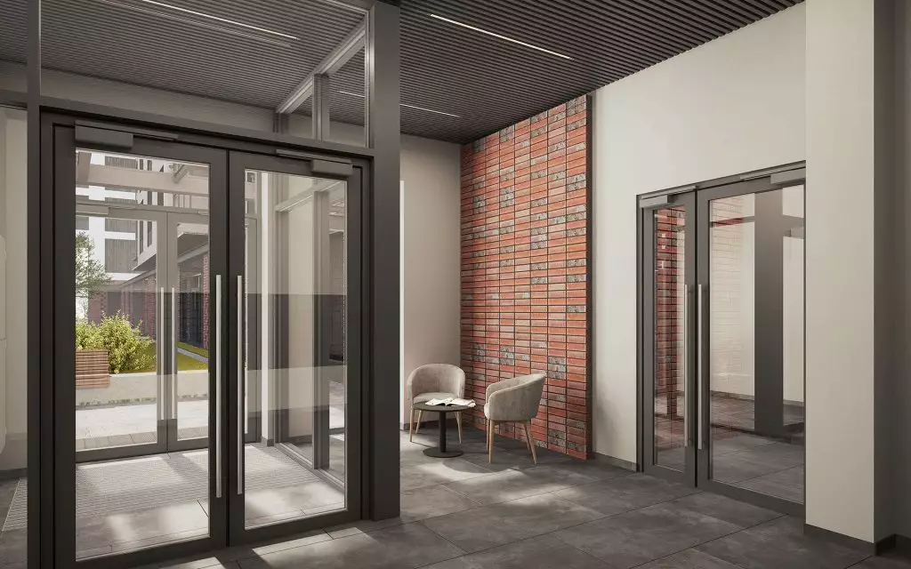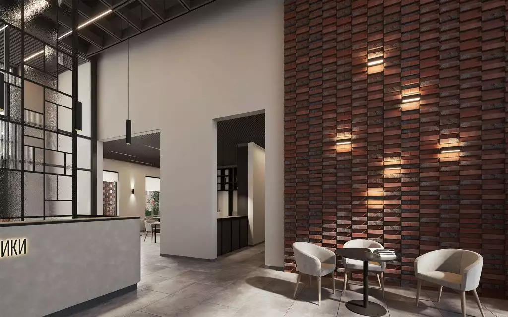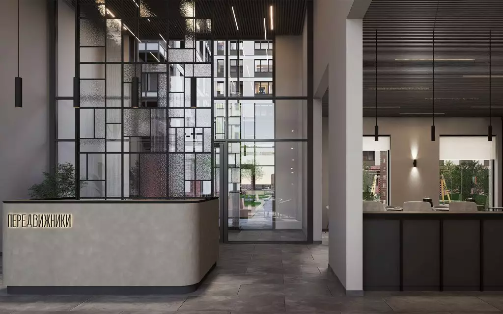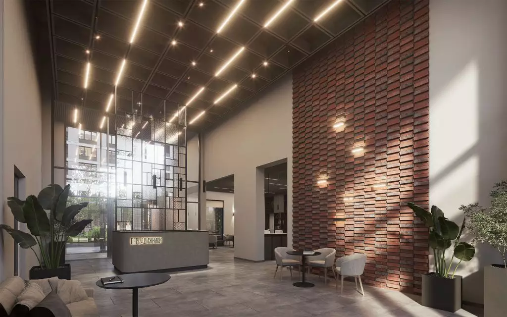 Лобби задумано как просторная светлая гостиная площадью 135 м² с потолками высотой 6 м. Панорамные окна наполняют это пространство дневным светом. Интерьер подчёркивает тему движения: линейные светильники, ассоциирующиеся с рельсами, и кирпичная фактура стеновой отделки продолжают индустриальные мотивы и архитектурный стиль фасадов. Общую концепцию завершит уникальный арт-объект — динамическая скульптура "Сложный баланс" российского архитектора и скульптора с мировым именем Владислава Бек-Булатова. Входная группа единого П-образного корпуса станет порталом между активным, динамичным городом и приватной, спокойной средой дома. Здесь появятся стойка ресепшн, лаунж-зоны для общения, коворкинг с кофепоинтом и free Wi-Fi для работы и творчества. Парадные будут иметь безбарьерные входы, удобные для родителей с колясками и маломобильных жителей. Для колясок и велосипедов выделят специально оборудованные помещения для хранения, а также уличные велопарковки. Первые этажи секций отведены под коммерческие помещения, благодаря чему все необходимые сервисы будут находиться в шаговой доступности. Для жителей предусмотрен подземный паркинг на 213 машино-мест, включающий 10 мест с зарядными станциями для электромобилей.
