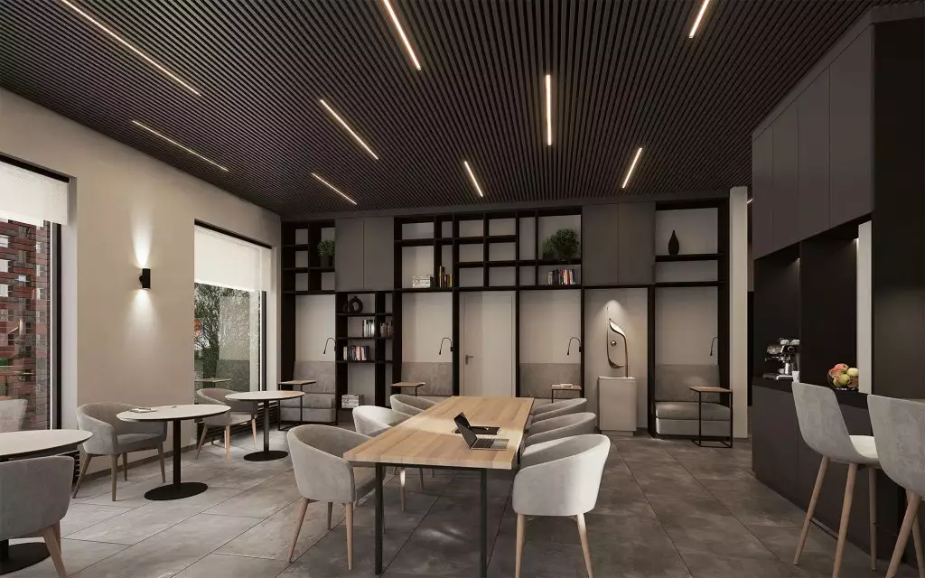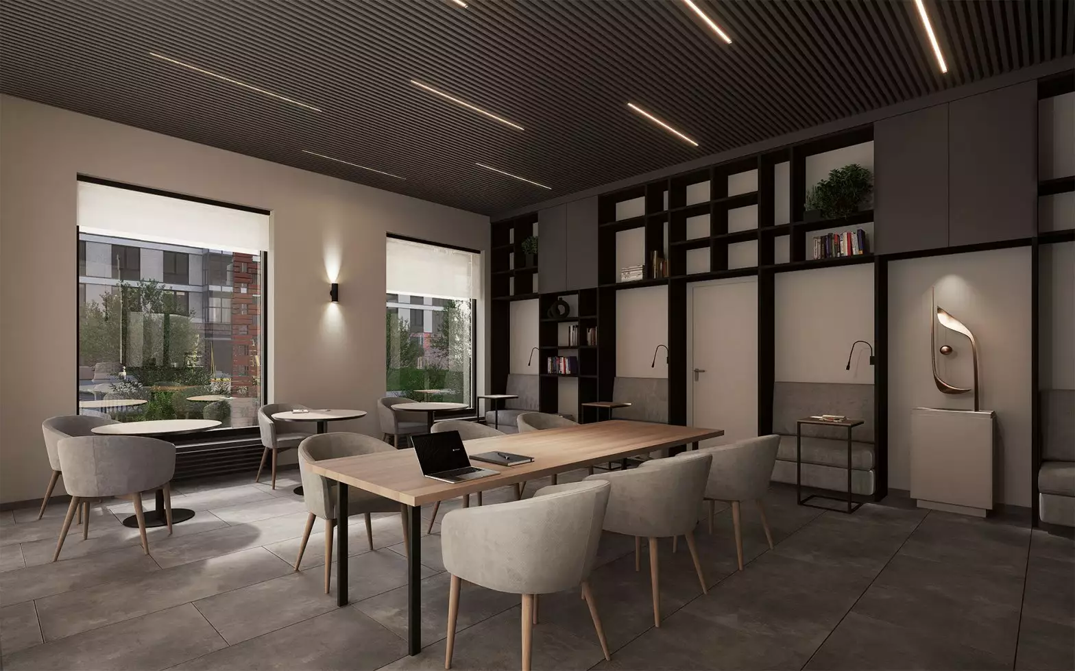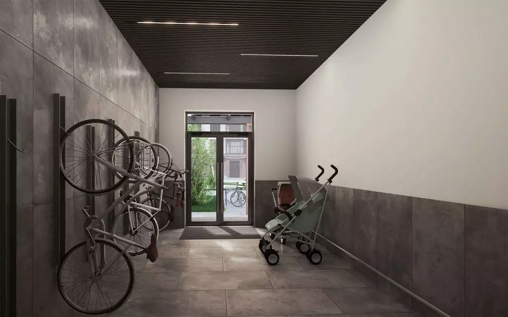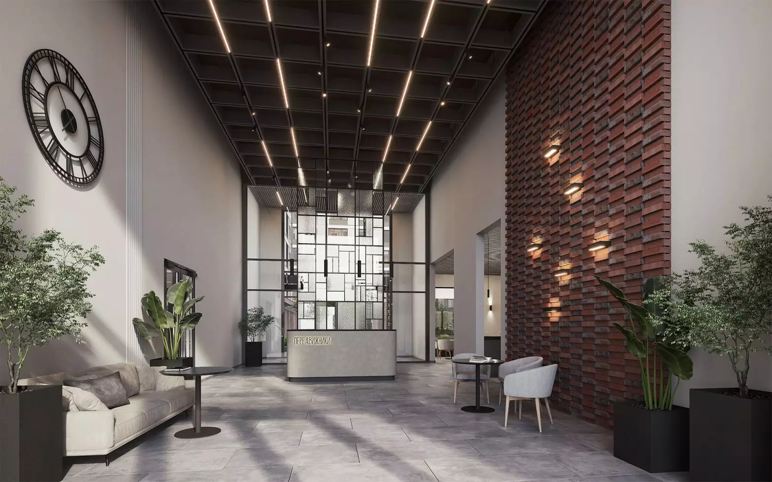 Лобби задумано как просторная светлая гостиная площадью 135 м² с потолками высотой 6 м. Панорамные окна наполняют это пространство дневным светом. Интерьер подчёркивает тему движения: линейные светильники, ассоциирующиеся с рельсами, и кирпичная фактура стеновой отделки продолжают индустриальные мотивы и архитектурный стиль фасадов. Общую концепцию завершит уникальный арт-объект — динамическая скульптура "Сложный баланс" российского архитектора и скульптора с мировым именем Владислава Бек-Булатова. Входная группа единого П-образного корпуса станет порталом между активным, динамичным городом и приватной, спокойной средой дома. Здесь появятся стойка ресепшн, лаунж-зоны для общения, коворкинг с кофепоинтом и free Wi-Fi для работы и творчества. Парадные будут иметь безбарьерные входы, удобные для родителей с колясками и маломобильных жителей. Для колясок и велосипедов выделят специально оборудованные помещения для хранения, а также уличные велопарковки. Первые этажи секций отведены под коммерческие помещения, благодаря чему все необходимые сервисы будут находиться в шаговой доступности. Для жителей предусмотрен подземный паркинг на 213 машино-мест, включающий 10 мест с зарядными станциями для электромобилей.