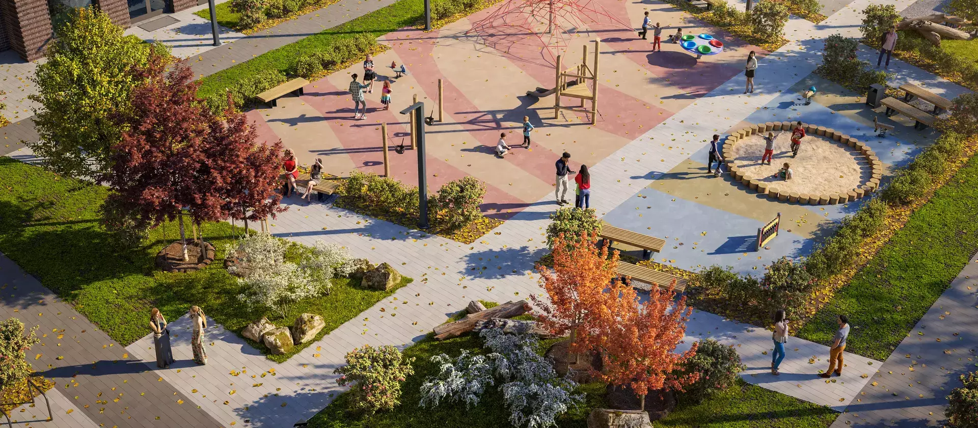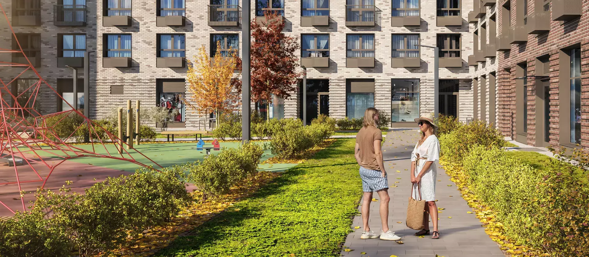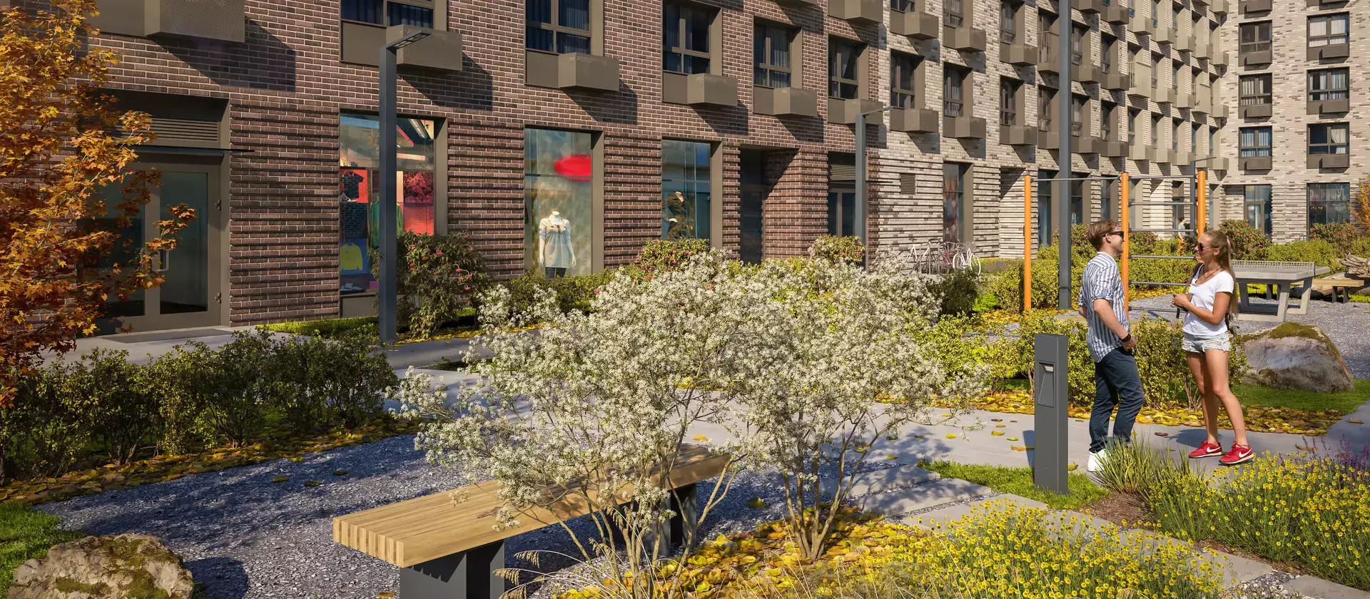 Закрытый не только для посторонних лиц, но и для проезда машин, двор ожидает озеленение и благоустройство. Застройщик намерен разбить здесь парк с местами для отдыха, детскими игровыми площадками, спортивными зонами, пешеходными и велодорожками и прогулочным бульваром. За границами придомовой территории запланированы открытые гостевые парковки. На первых этажах корпусов откроются магазины, кафе, пекарни, аптеки, салоны красоты и т.п. Подобные коммерческие заведения доступны и в соседнем жилом комплексе Витебский парк, возводимом тем же застройщиком. В составе встроенной инфраструктуры двух соседствующих ЖК появятся: