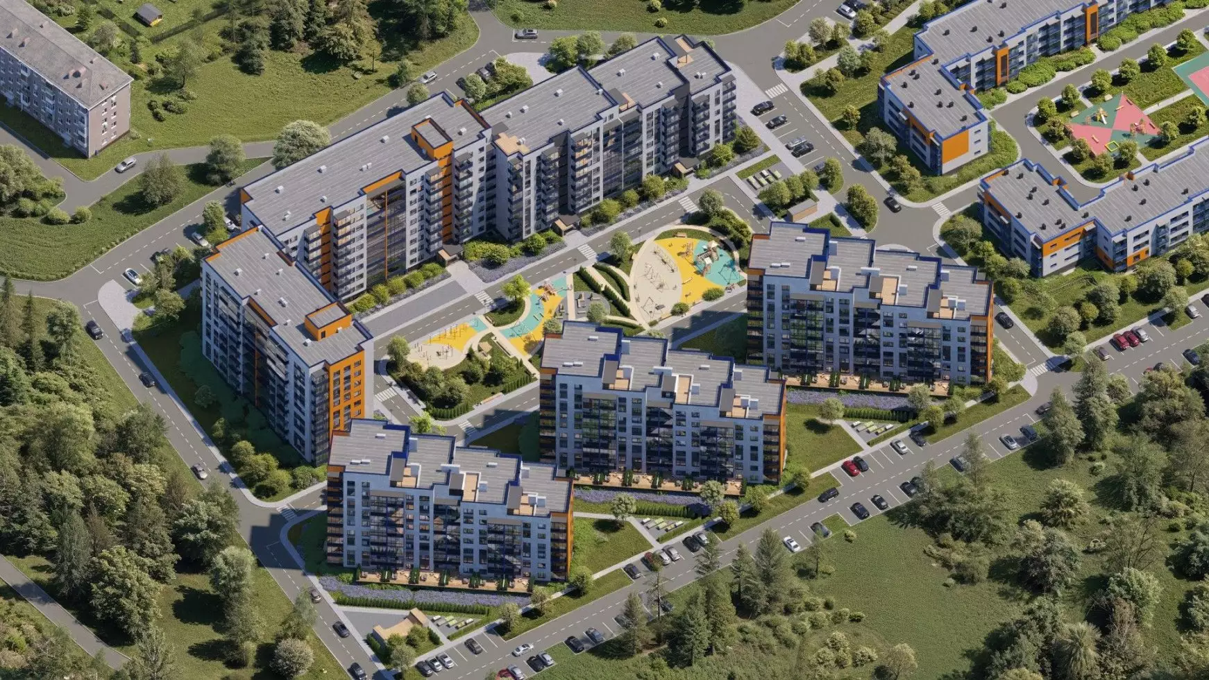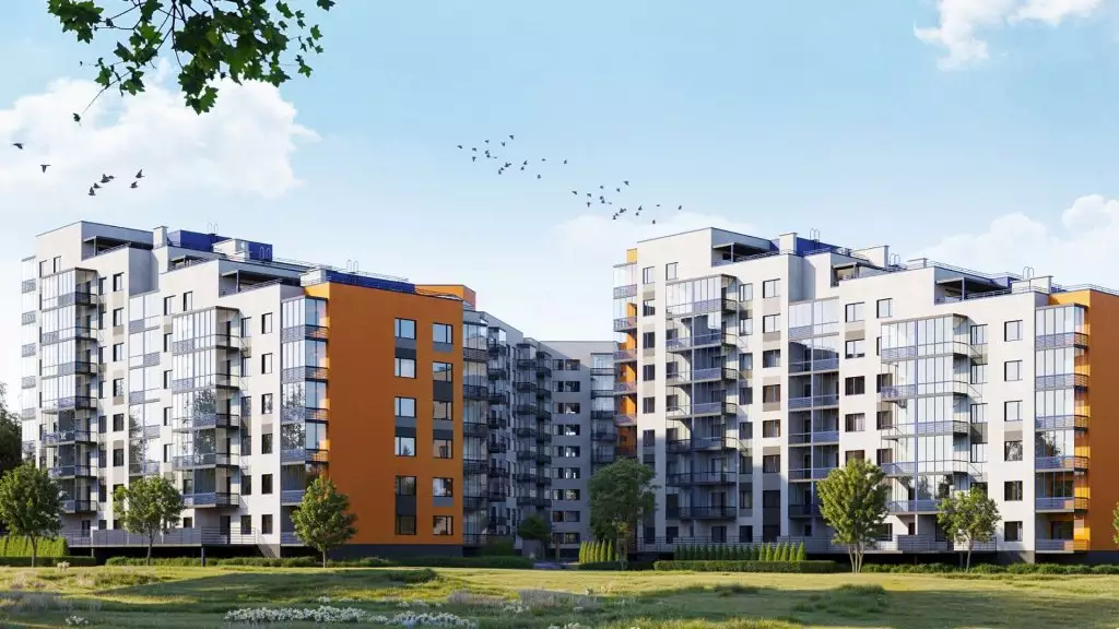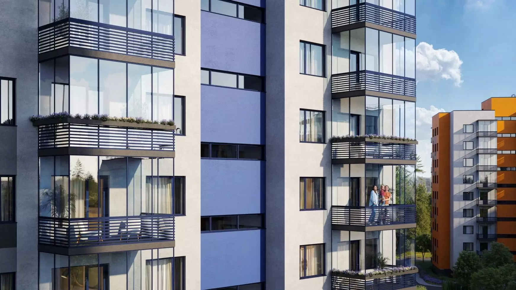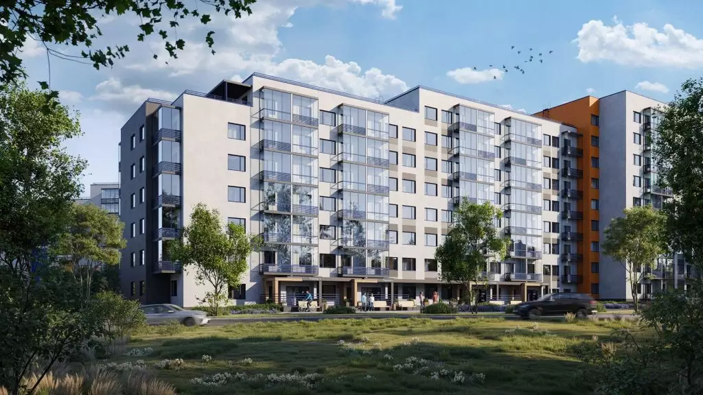 Проект новостройки выполнен в современном европейском стиле, сочетающем минимализм и функциональность. Фасад оформлен в нейтральных тонах с акцентными элементами в виде оранжевых и голубых вставок, что придаёт ансамблю визуальную динамику. Большие панорамные окна и застеклённые балконы создают ощущение открытого пространства и наполняют помещения естественным светом. Архитектура жилого комплекса характеризуется лаконичными формами и строгими геометрическими линиями. Использование стекла в отделке подчёркивает современный характер проекта, а сочетание различных материалов делает фасад выразительным. Нижний уровень обустроен для функционального использования: в корпусах выделены входные группы, холлы, места общего пользования и коммерческие помещения. Дизайн интерьеров вдохновлён скандинавскими мотивами, оформлен в светлой цветовой гамме и подчёркивает концепцию комплекса. Прозрачные двери обеспечивают хороший обзор двора. Навигация по этажам продумана, а освещение коридоров сделает передвижение комфортным. При входах выделены удобные зоны для хранения велосипедов и колясок. Подземный паркинг проектом не предусмотрен.