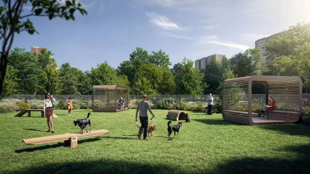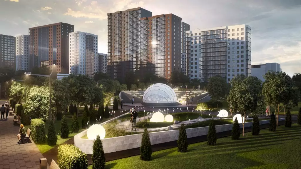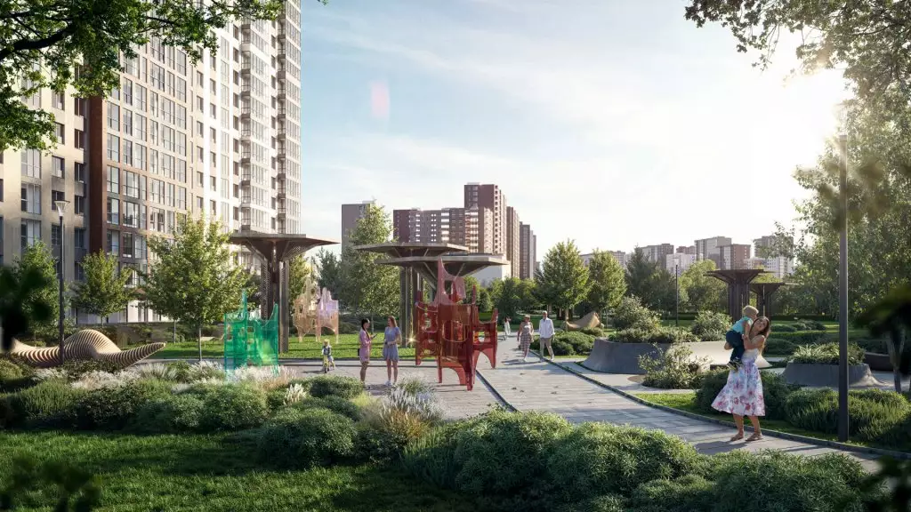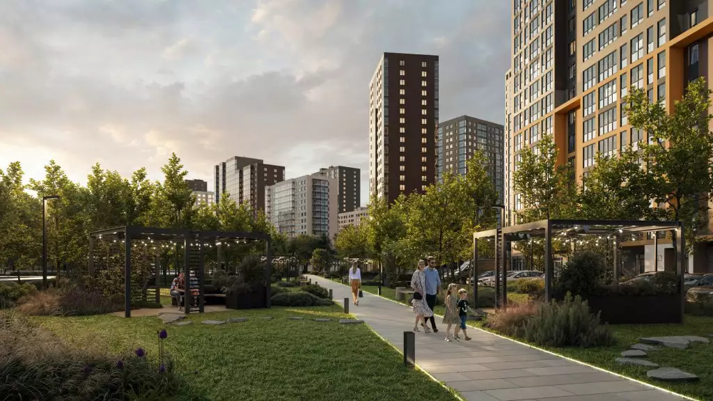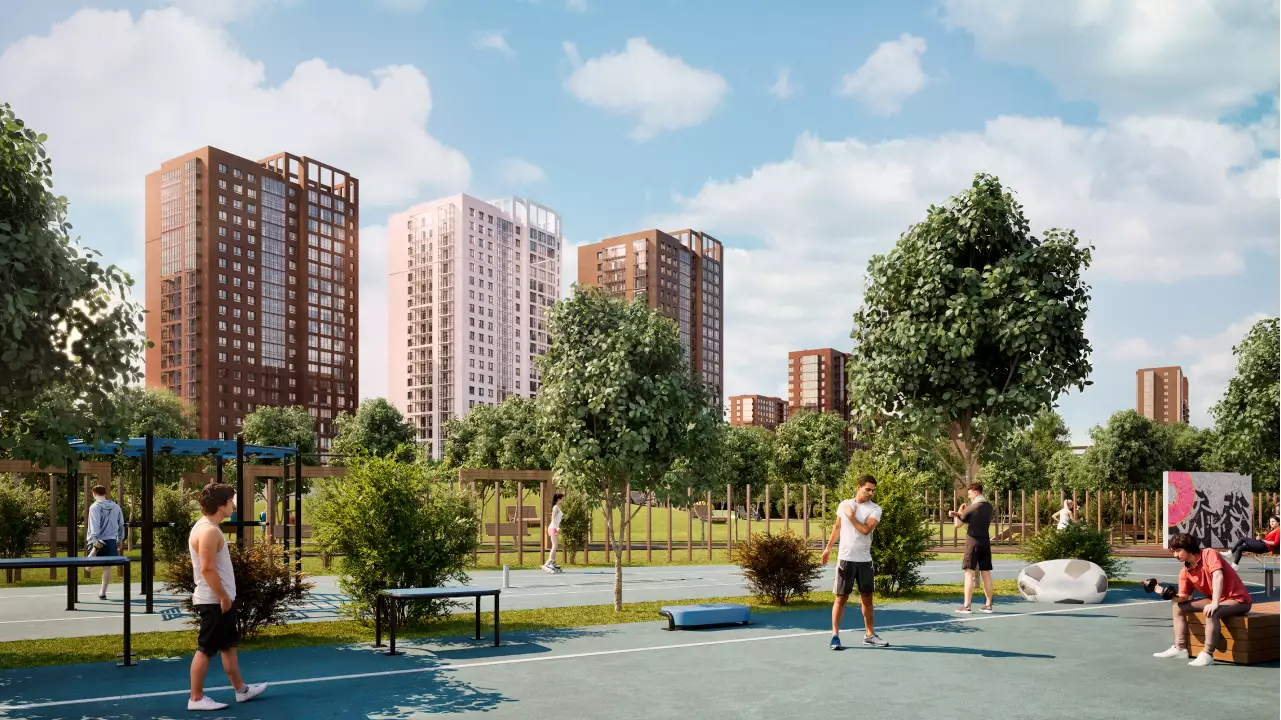 Придомовая территория новостройки планируется как закрытая и имеющая контролируемый доступ в формате "двор без машин". Благоустройство территории включает газоны, посадку деревьев и кустарников, а также элементы озеленения вдоль прогулочных маршрутов внутри кварталов. Во дворах жилого комплекса предполагается функциональное зонирование. Детская инфраструктура будет представлена игровыми площадками и игровыми комплексами, рассчитанными на разные возрастные группы. Для физической активности запланированы открытые спортивные площадки, уличные тренажеры, беговые и велодорожки. Для спокойного отдыха предусмотрены прогулочные маршруты, скамейки, малые архитектурные формы и тихие зоны отдыха во дворах. Кроме того, проектом предусмотрен центральный прогулочный бульвар протяжённостью более 1,2 км с озеленёнными аллеями, пешеходными маршрутами и парковой зоной площадью около 2 га. Рядом с ней застройщик устроит многофункциональное общественное пространство, ориентированное на общение и совместную активность жителей: здесь планируются коворкинг, мастерская, арт-пространство, ярмарочная площадка, детский центр и сезонный летний кинотеатр, а сама территория предполагается как место для занятий йогой, проведения мастер-классов, праздников, совместной работы и досуга. Также в состав встроенной инфраструктуры микрорайона войдут: