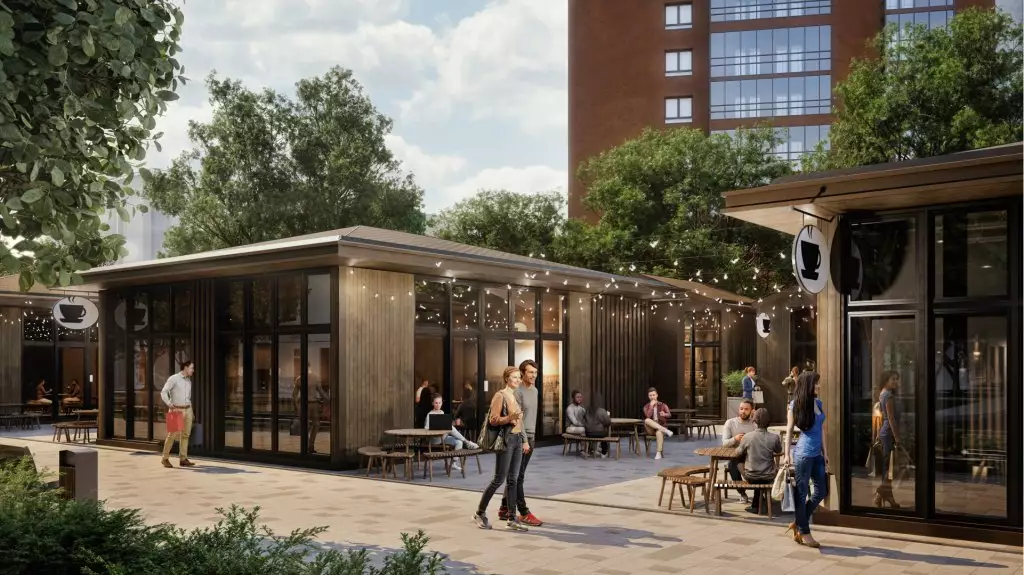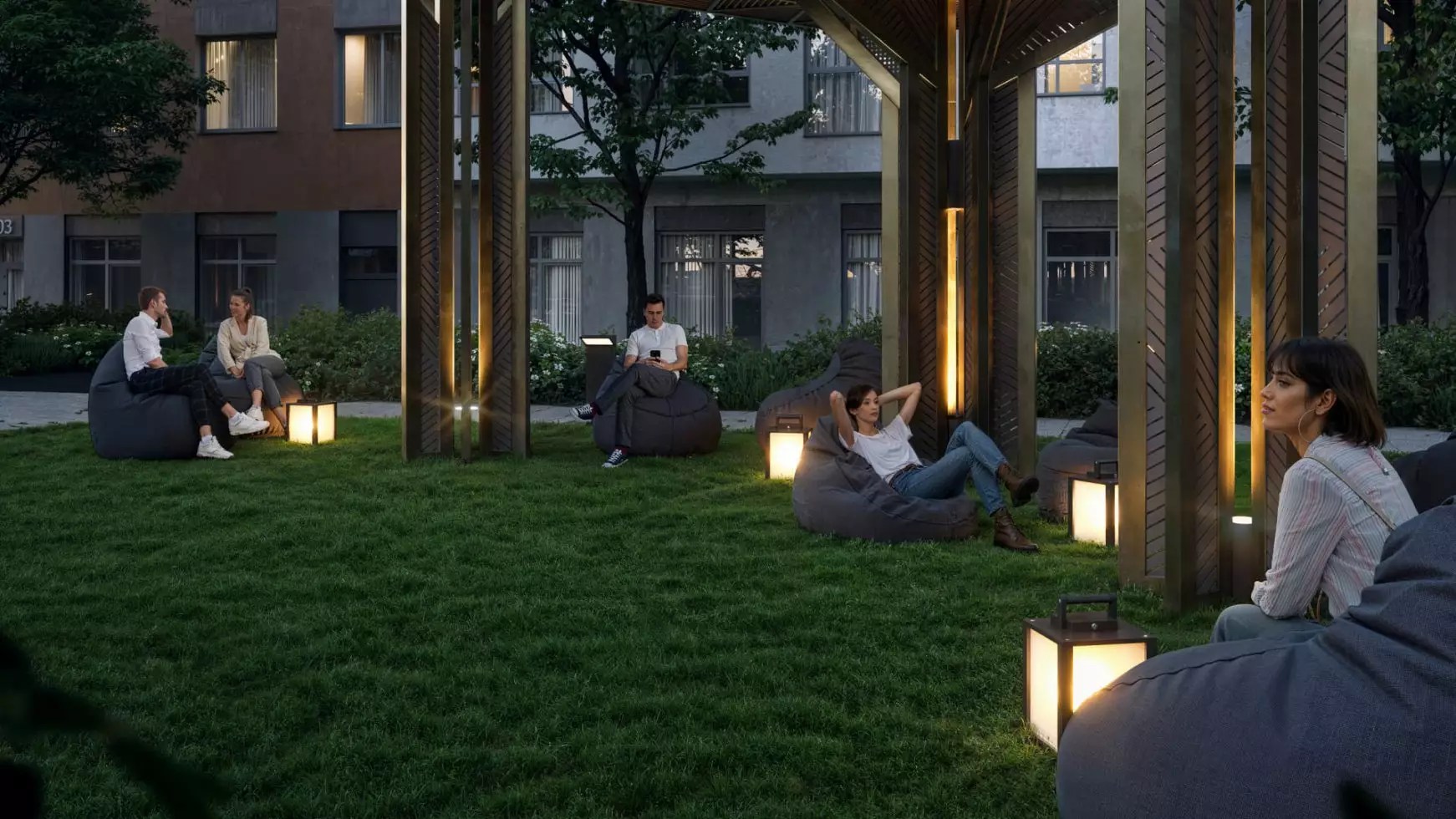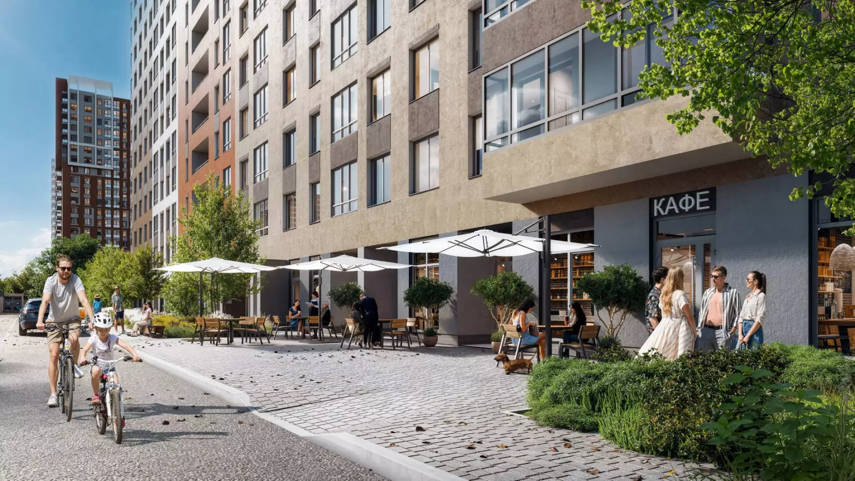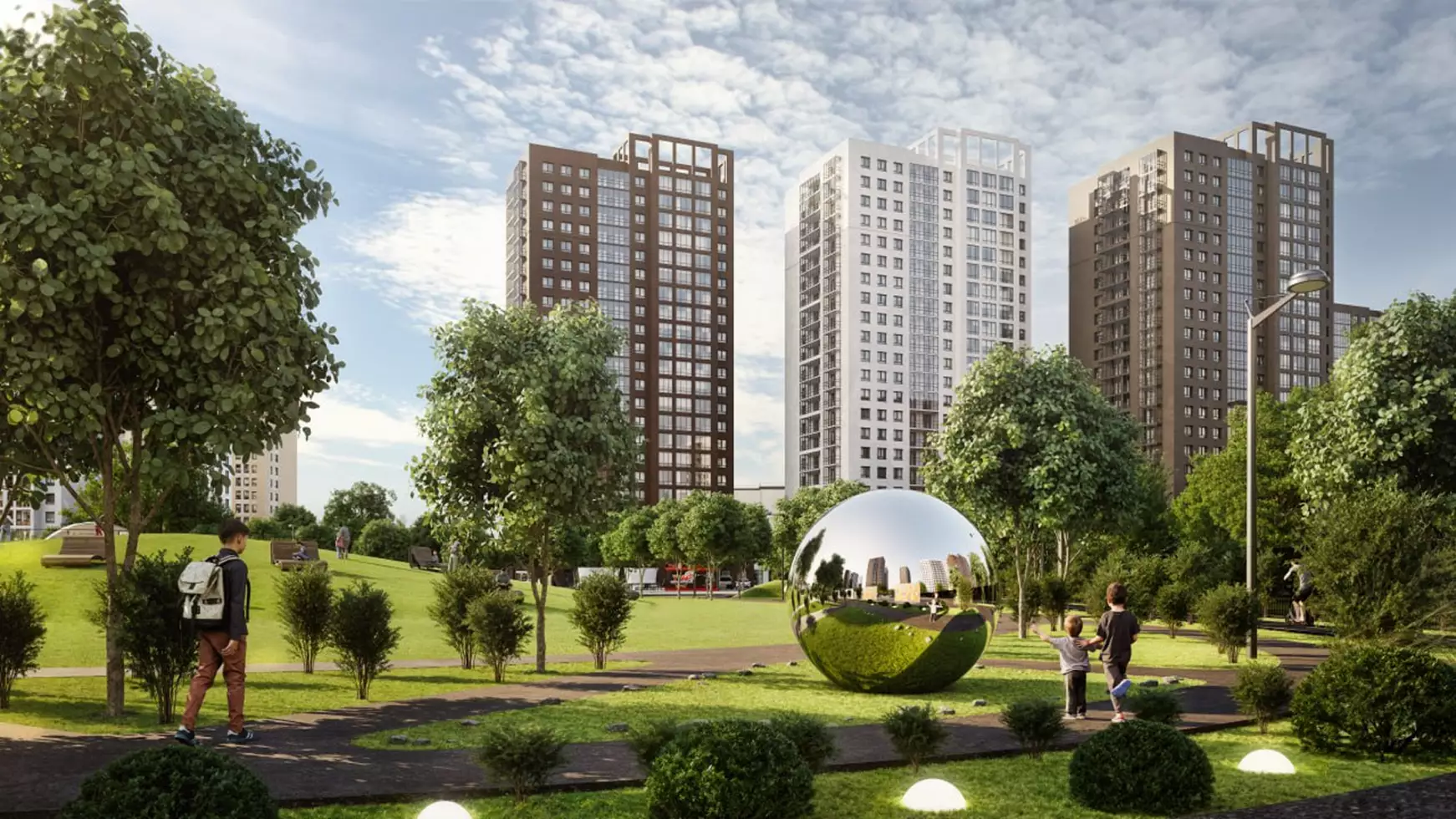 Придомовая территория новостройки планируется как закрытая и имеющая контролируемый доступ в формате "двор без машин". Благоустройство территории включает газоны, посадку деревьев и кустарников, а также элементы озеленения вдоль прогулочных маршрутов внутри кварталов. Во дворах жилого комплекса предполагается функциональное зонирование. Детская инфраструктура будет представлена игровыми площадками и игровыми комплексами, рассчитанными на разные возрастные группы. Для физической активности запланированы открытые спортивные площадки, уличные тренажеры, беговые и велодорожки. Для спокойного отдыха предусмотрены прогулочные маршруты, скамейки, малые архитектурные формы и тихие зоны отдыха во дворах. Кроме того, проектом предусмотрен центральный прогулочный бульвар протяжённостью более 1,2 км с озеленёнными аллеями, пешеходными маршрутами и парковой зоной площадью около 2 га. Рядом с ней застройщик устроит многофункциональное общественное пространство, ориентированное на общение и совместную активность жителей: здесь планируются коворкинг, мастерская, арт-пространство, ярмарочная площадка, детский центр и сезонный летний кинотеатр, а сама территория предполагается как место для занятий йогой, проведения мастер-классов, праздников, совместной работы и досуга. Также в состав встроенной инфраструктуры микрорайона войдут: