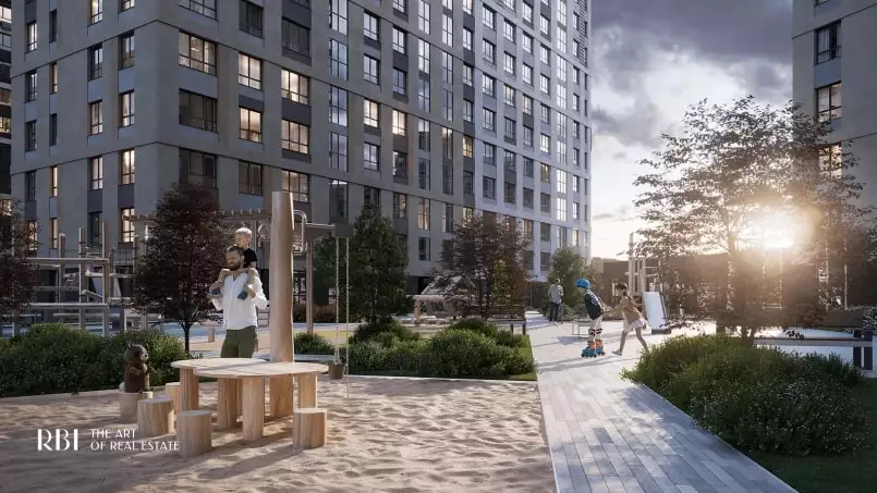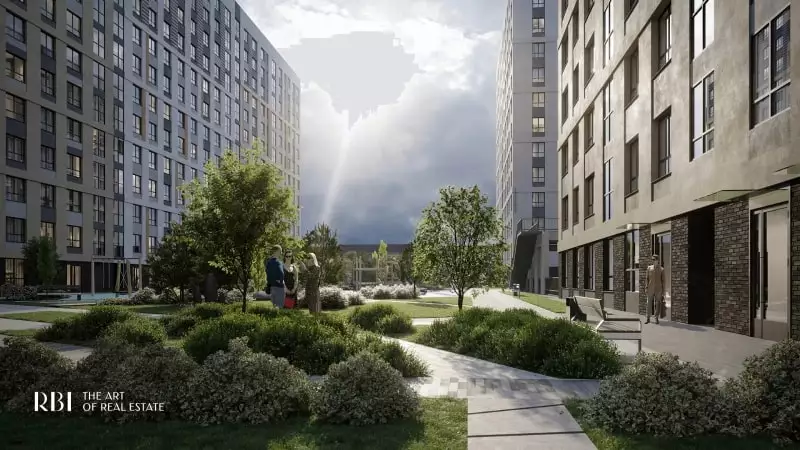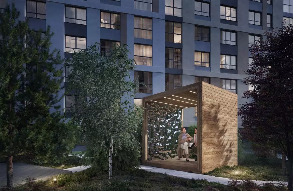 Проект благоустройства придомовой территории разработала известная студия L.BURO. Охраняемый двор новостройки расположится на крыше стилобата. В нем застройщик намерен разбить пейзажный парк с искусственным ручьем, зеленой комнатой, садом камней, уединенными уголками с лежаками и качелями, прогулочными дорожками и декоративной подсветкой в темное время суток. Для детских игр предусмотрена отдельная площадка с огромными песочницами, для занятий спортом выделят места с уличными тренажерами, шахматами и столами для настольного тенниса, проложат велодорожку. Украшением двора-сада станут еще два арт-объекта авторства Владимира Полякова.