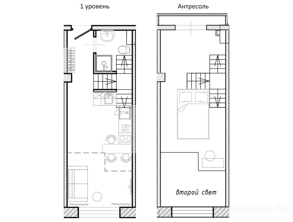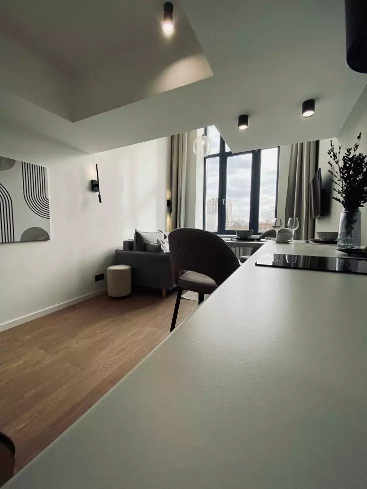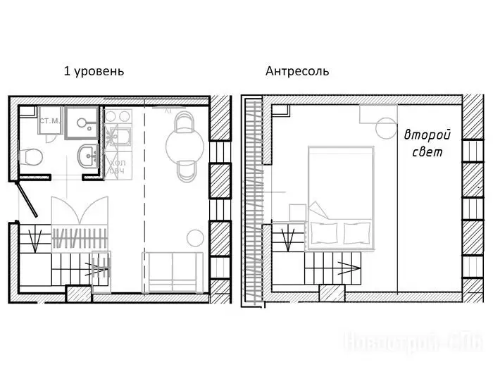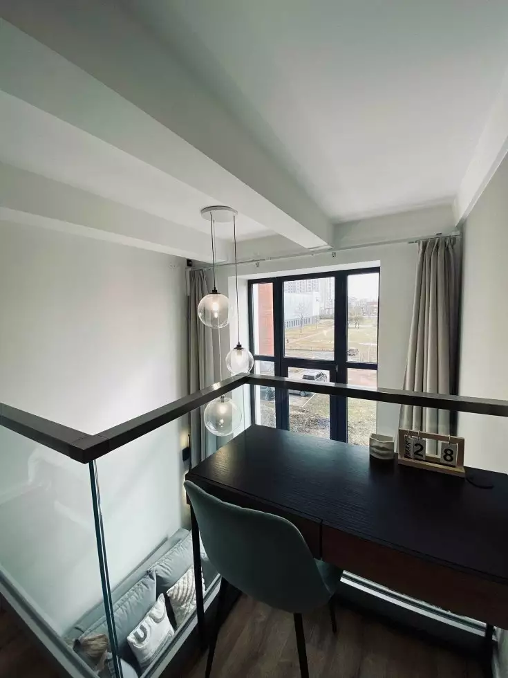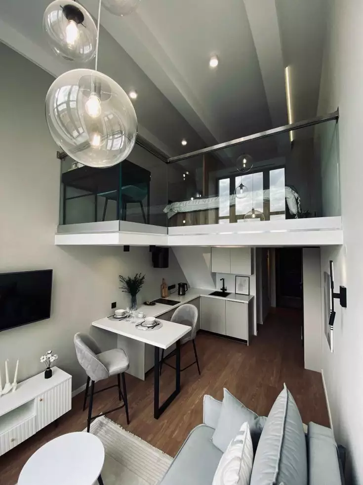 Покупателям недвижимости предлагают двухуровневые варианты студийных планировок площадью от 19,8 до 36,9 м² с потолками 4,2 м на первых пяти этажах и 5 м на последнем. Во всех номерах оборудованы антресольные ярусы, где можно устроить спальное место или зону хранения. Виды из большинства окон открываются на ближайший сквер. Апартаменты сдаются застройщиком без отделки. Она возможна за отдельную плату, как и меблировка.