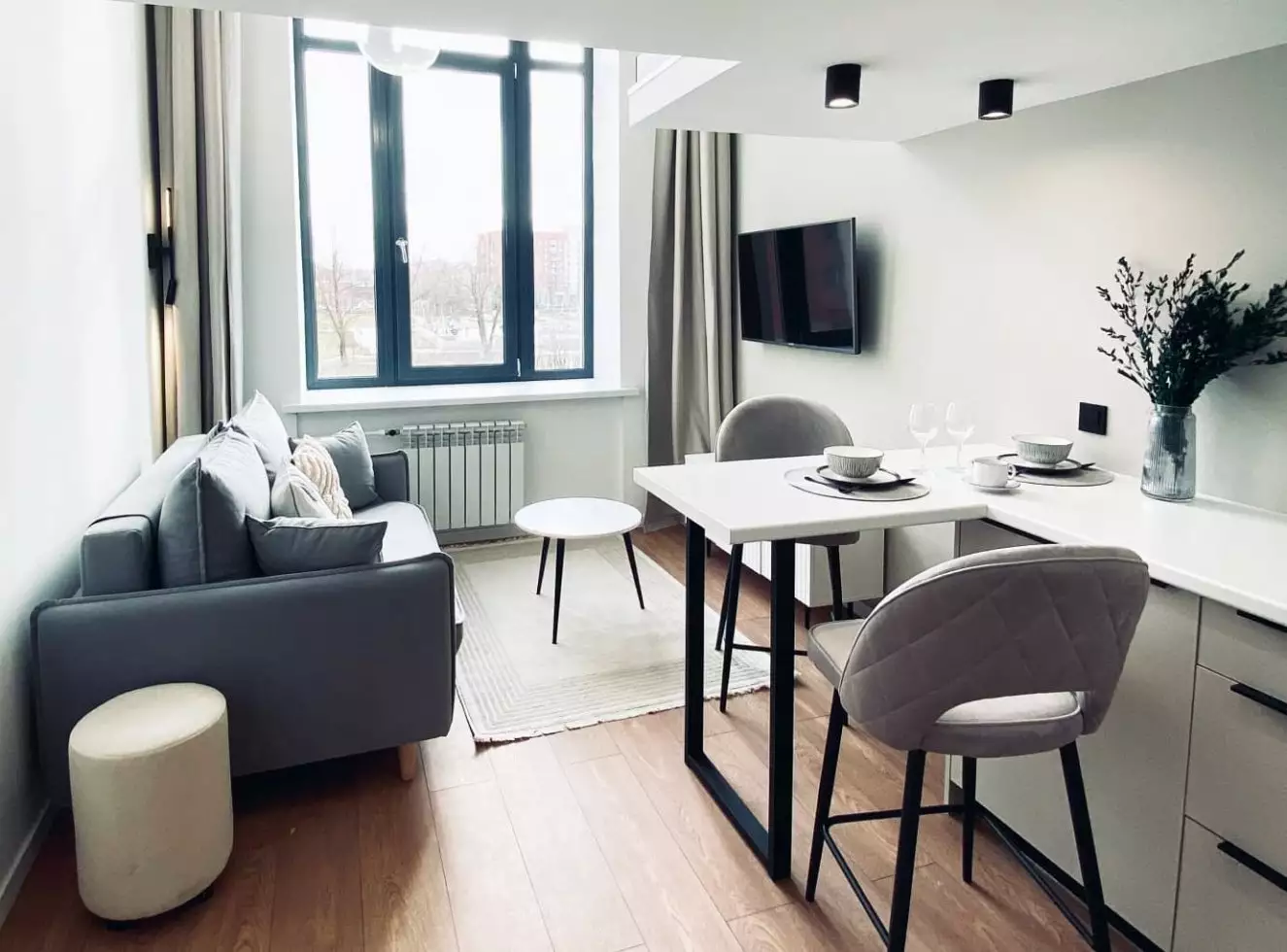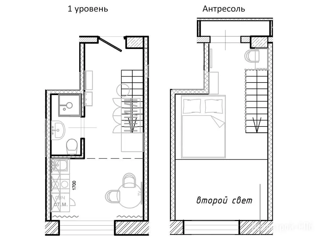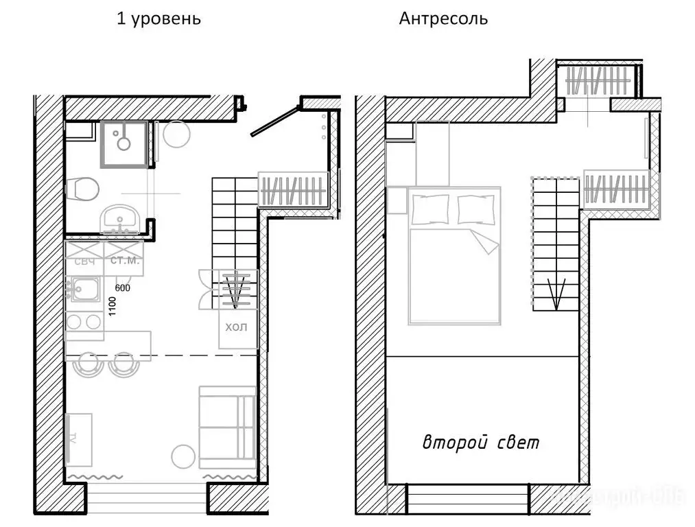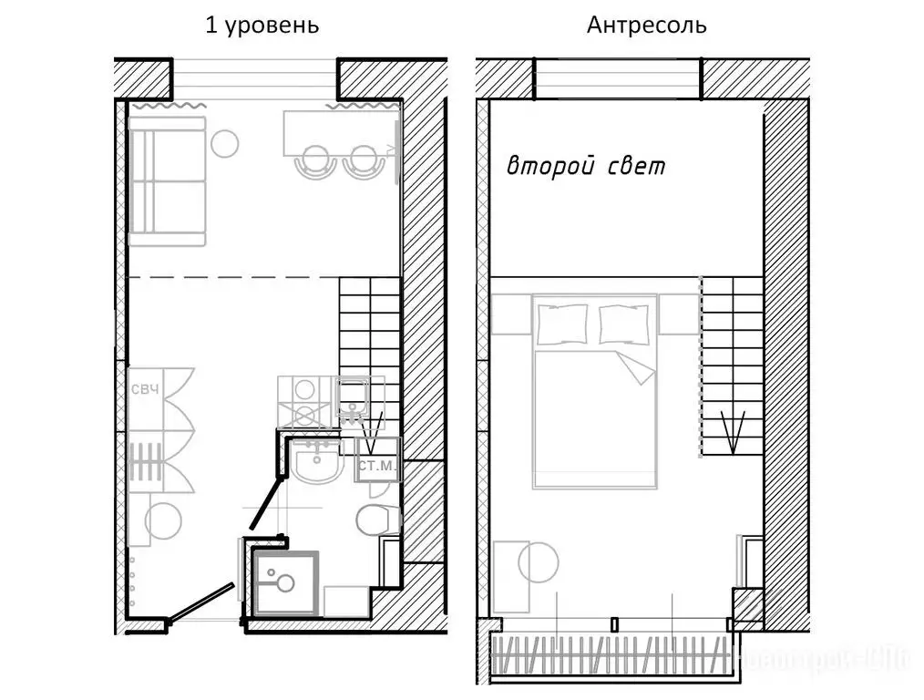 Покупателям недвижимости предлагают двухуровневые варианты студийных планировок площадью от 19,8 до 36,9 м² с потолками 4,2 м на первых пяти этажах и 5 м на последнем. Во всех номерах оборудованы антресольные ярусы, где можно устроить спальное место или зону хранения. Виды из большинства окон открываются на ближайший сквер. Апартаменты сдаются застройщиком без отделки. Она возможна за отдельную плату, как и меблировка.
