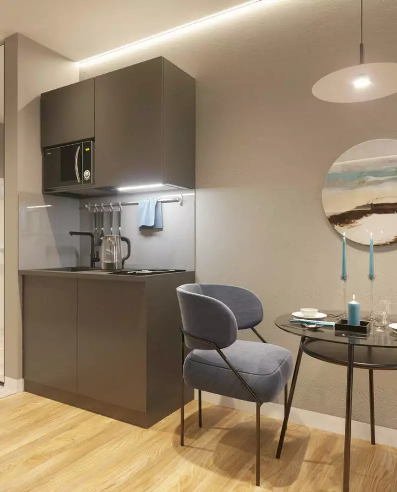 Покупателям недвижимости предлагаются студии с эргономичными планировками площадью от 23 до 33 м² с чистовой отделкой, мебелью, бытовой техникой и предметами интерьера. В номерах доступен Wi-Fi. Апартаменты полностью готовы для проживания.