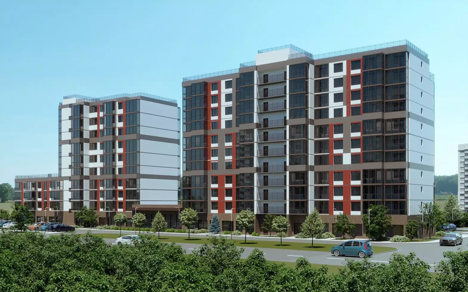 ЖК Рубеж возводится по индивидуальному проекту в современном европейском стиле. Это минималистичная, непритязательная современная архитектура без излишеств. В подъездах и МОПах выполнят лаконичную отделку интерьеров. На первом этаже спроектированы колясочные помещения и кладовые боксы, а также площади под коммерческие заведения. Подземного паркинга проектом не предусмотрено.