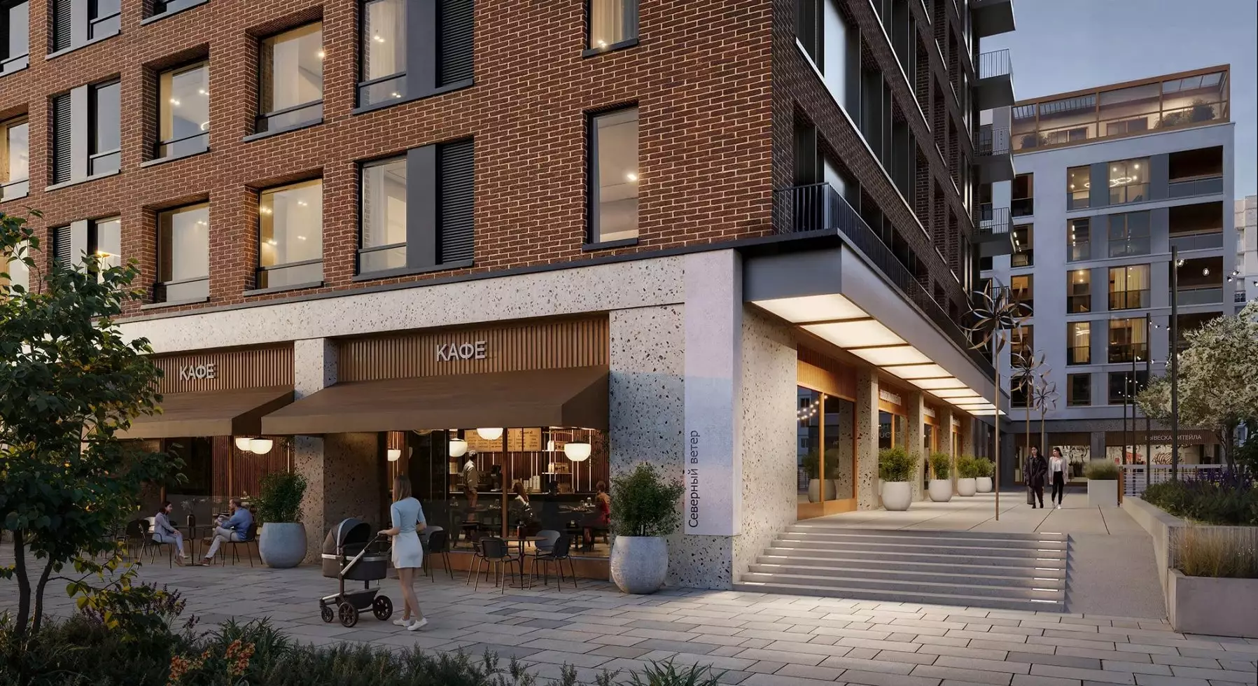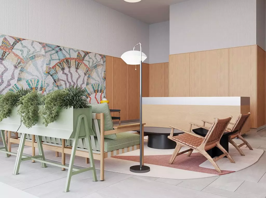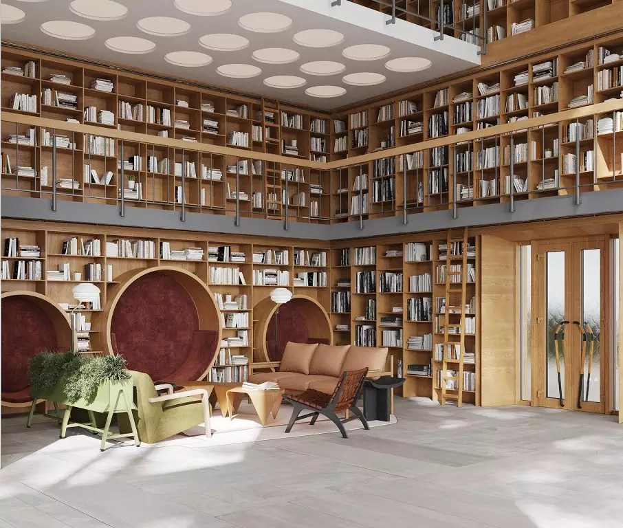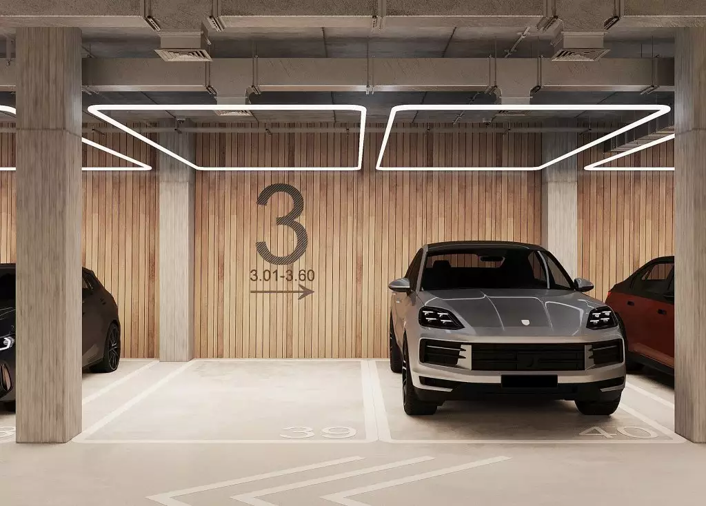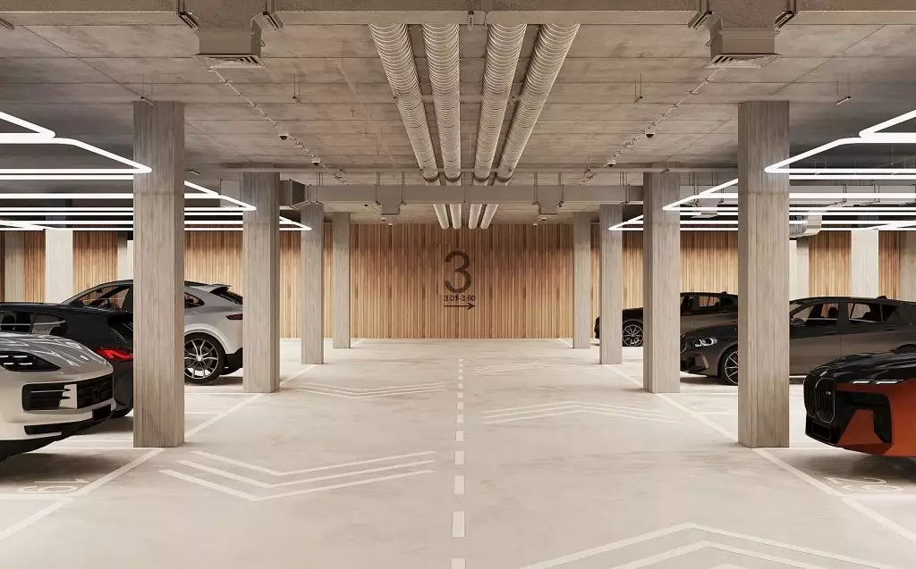 В жилом комплексе предусмотрены два типа лобби: просторные главные и компактные для каждой секции. Основные входные группы отличаются двухсветными пространствами, панорамным остеклением и обилием декоративных элементов. Для оформления интерьеров используют натуральные материалы: дерево, камень и текстиль природных оттенков. Пространство дополняют мягкая мебель, растения и акцентные светильники. В одном из главных лобби обустроят библиотеку с уютной зоной для чтения. Компактные входные группы оформлены в лаконичном стиле, сочетающем текстуру бетона и дерева. В каждой секции предусмотрены помещения для хранения детских колясок, а велосипеды можно будет размещать в специально выделенных зонах на уровне подземного паркинга. Его интерьер выполнен в минималистичном стиле с теплыми оттенками в отделке. Здесь используют панели с текстурой дерева и бетонные покрытия. Внутреннее пространство парковки оборудовано современной системой навигации, четкой разметкой и линейным освещением. Для удобства жильцов предусмотрены станции подкачки шин и зарядки электромобилей. В зимний период в паркинге поддерживается комфортная плюсовая температура.