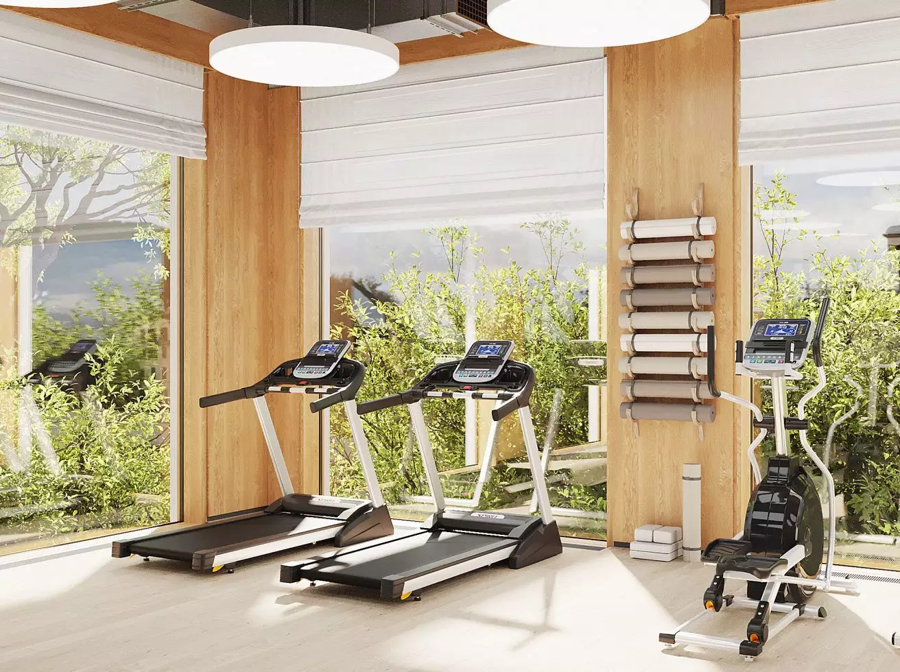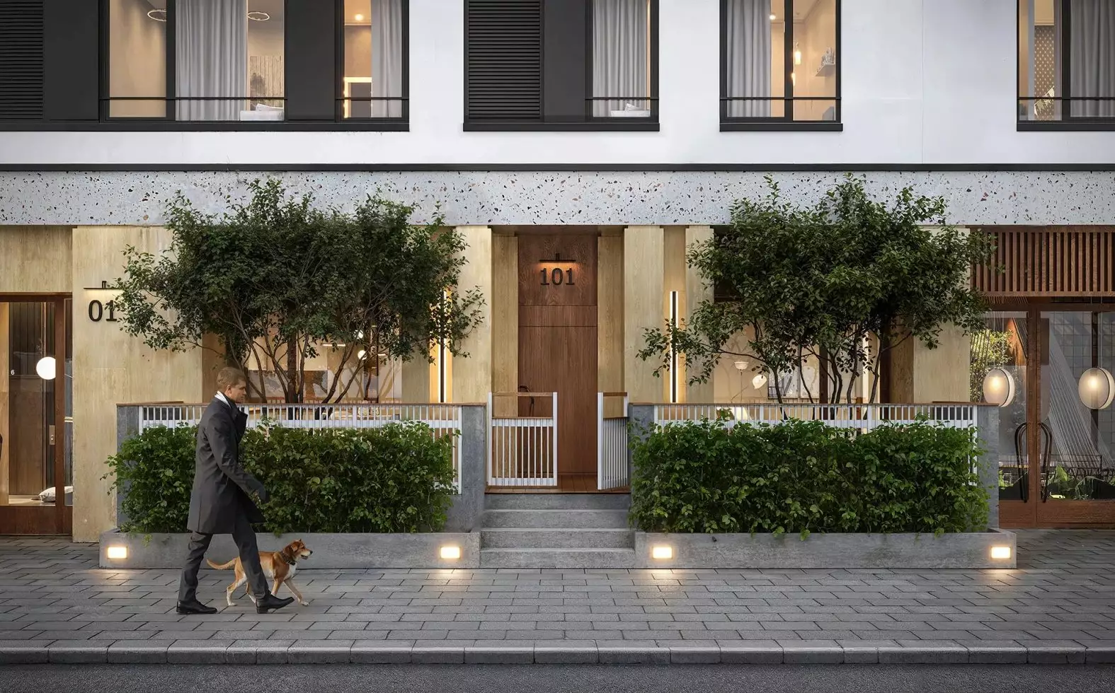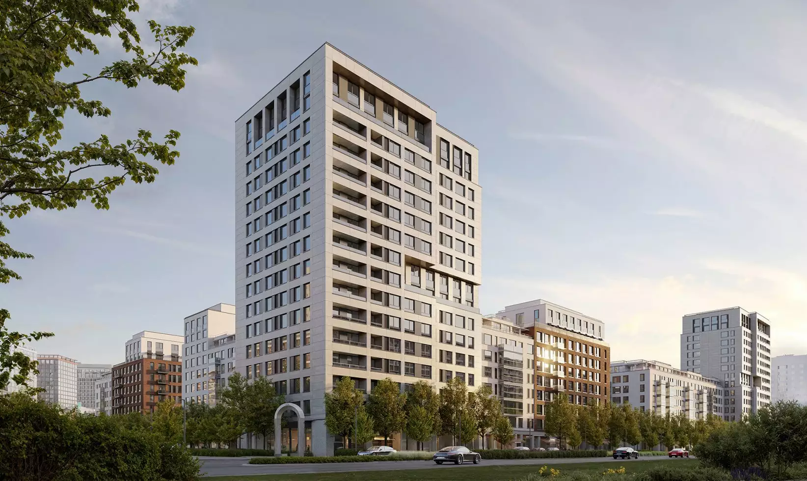 В жилом комплексе предусмотрены два типа лобби: просторные главные и компактные для каждой секции. Основные входные группы отличаются двухсветными пространствами, панорамным остеклением и обилием декоративных элементов. Для оформления интерьеров используют натуральные материалы: дерево, камень и текстиль природных оттенков. Пространство дополняют мягкая мебель, растения и акцентные светильники. В одном из главных лобби обустроят библиотеку с уютной зоной для чтения. Компактные входные группы оформлены в лаконичном стиле, сочетающем текстуру бетона и дерева. В каждой секции предусмотрены помещения для хранения детских колясок, а велосипеды можно будет размещать в специально выделенных зонах на уровне подземного паркинга. Его интерьер выполнен в минималистичном стиле с теплыми оттенками в отделке. Здесь используют панели с текстурой дерева и бетонные покрытия. Внутреннее пространство парковки оборудовано современной системой навигации, четкой разметкой и линейным освещением. Для удобства жильцов предусмотрены станции подкачки шин и зарядки электромобилей. В зимний период в паркинге поддерживается комфортная плюсовая температура.