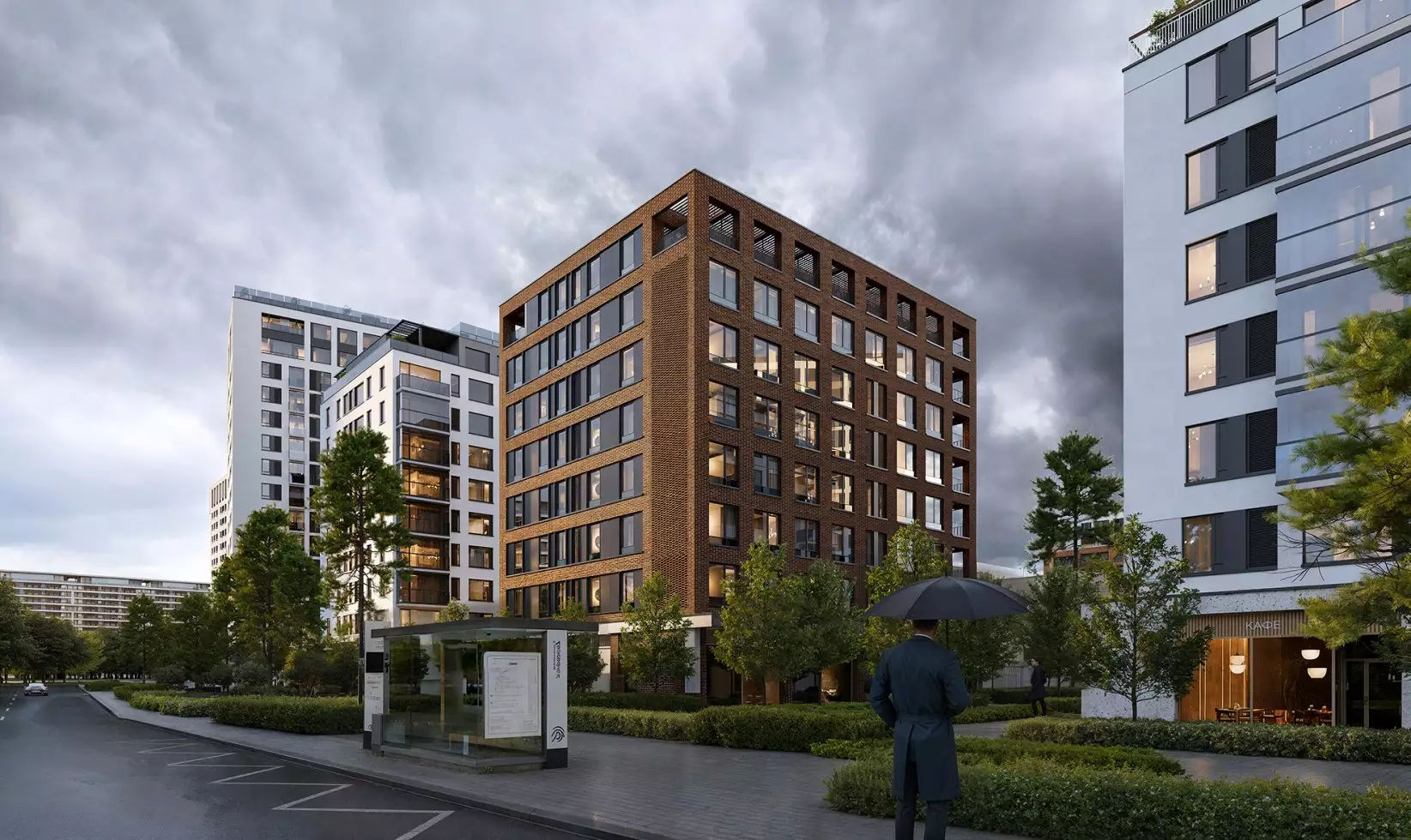 Архитектура квартала сочетает разные типы зданий: среднеэтажные корпуса, урбан-виллы, таунхаусы и башни-доминанты. Такое разнообразие создает динамичный ритм застройки и гармонично вписывает проект в окружающую среду. В стилистике строений читается североевропейский модернизм и функционализм. Отделка стен выполнена из пористого керамогранита и бетона с цветными вкраплениями, придающих экстерьеру выразительность. Чередующиеся окна и глухие простенки формируют динамику фасадов. Панорамные окна, лоджии и террасы позволяют наслаждаться видами на залив и благоустроенные дворы. Веранды на крышах урбан-вилл станут одной из архитектурных особенностей комплекса. Теплая цветовая палитра экстерьера делает облик квартала гармоничным и естественным. В освещении и деталях уделено внимание созданию уютной атмосферы: тёплый свет кафе, аккуратные витрины магазинов, минималистичные вывески и зелёные насаждения формируют комфортное городское пространство.
