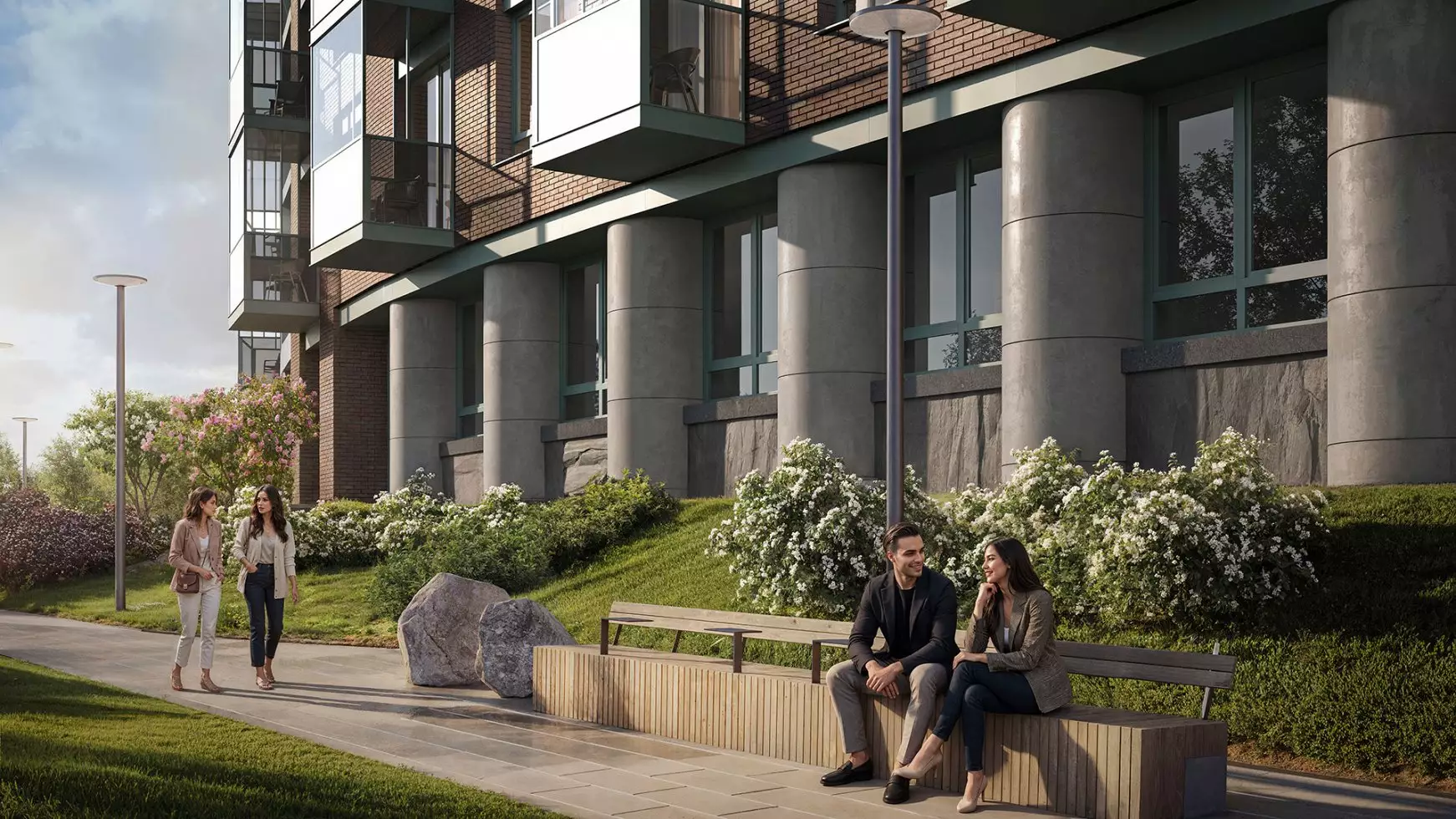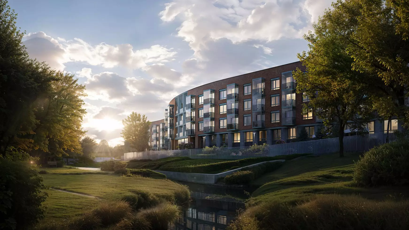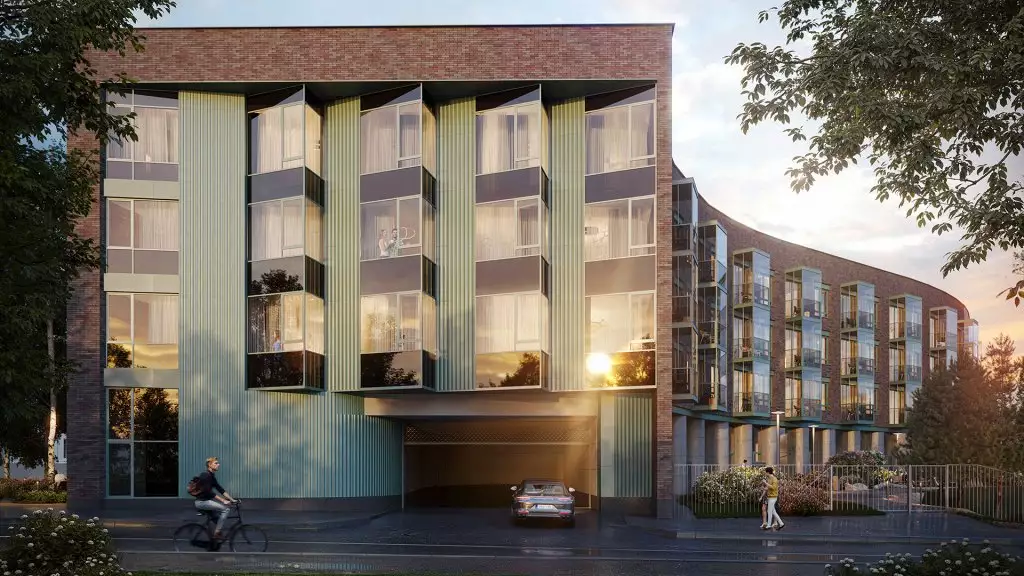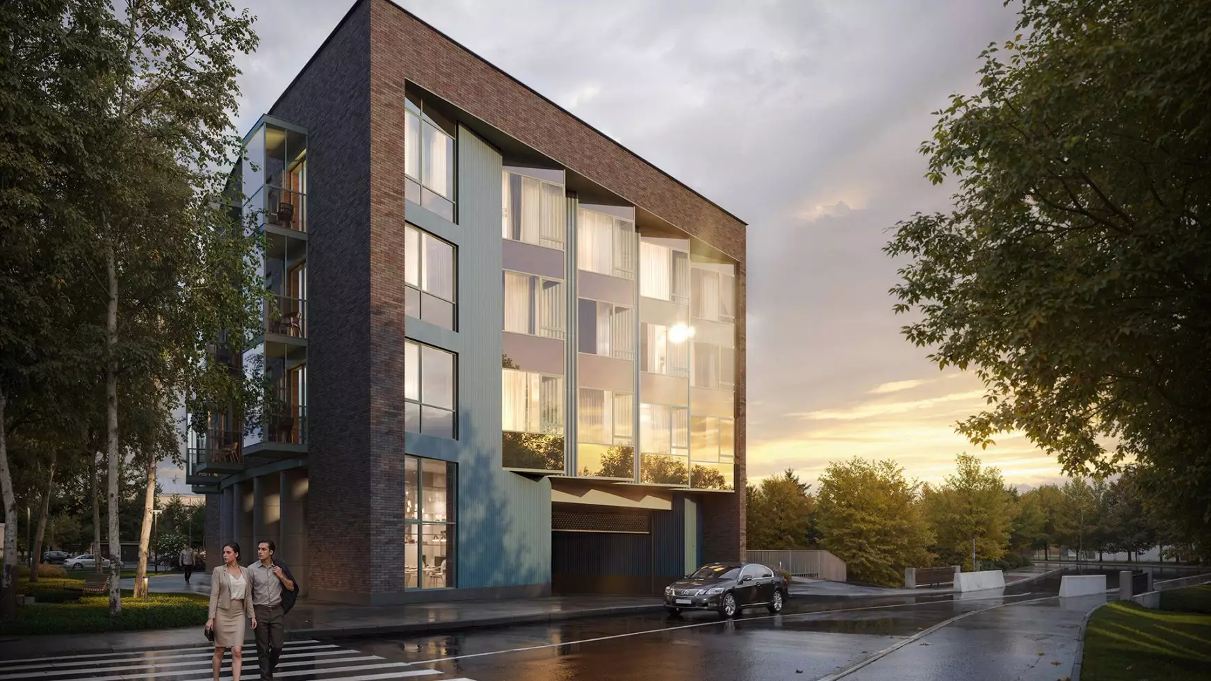 Архитектурная концепция разработана бюро "Проектная культура". В основе образа — минималистичный зигзагообразный силуэт фасада, отсылающий к европейским гостиницам 30-х годов XX века и переосмысляющий пластичность модерна. Архитектура выстроена на тонком балансе формы и ритма: панорамное остекление органично сочетается с кирпичными стенами, создавая выразительный и одновременно сдержанный облик. Визуальный образ жилого комплекса вдохновлён эстетикой воды: конфигурация здания повторяет плавный изгиб Жемчужного ручья, на берегу которого расположен дом, а изящная линия фасада словно следует за естественным руслом, мягко огибающим участок. Кирпичная облицовка терракотового оттенка продолжает традиции классической застройки Зеленогорска и в то же время вызывает ассоциации с тёплыми красками закатного неба, подчеркивая связь дома с окружающим ландшафтом. А лазурные акцентные вставки добавляют объему глубины и напоминают о волнах Финского залива, еще больше усиливая ощущение близости природной среды.