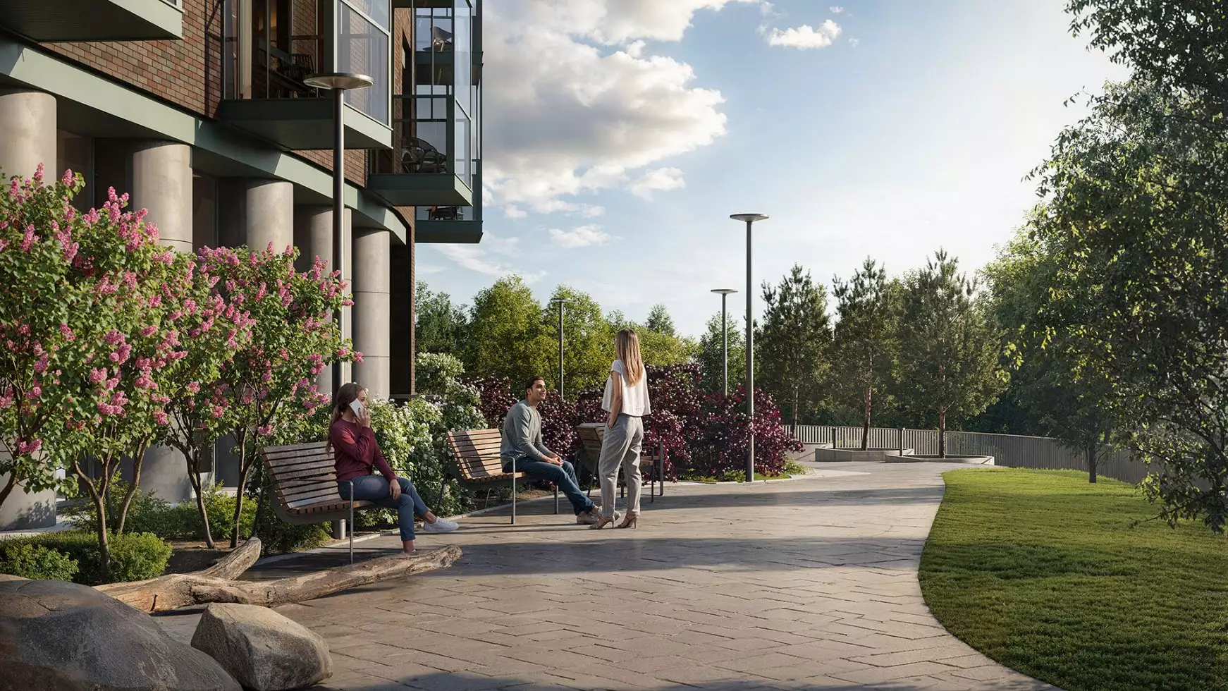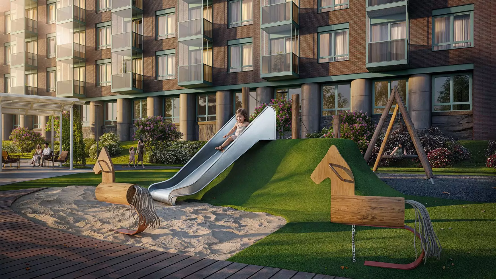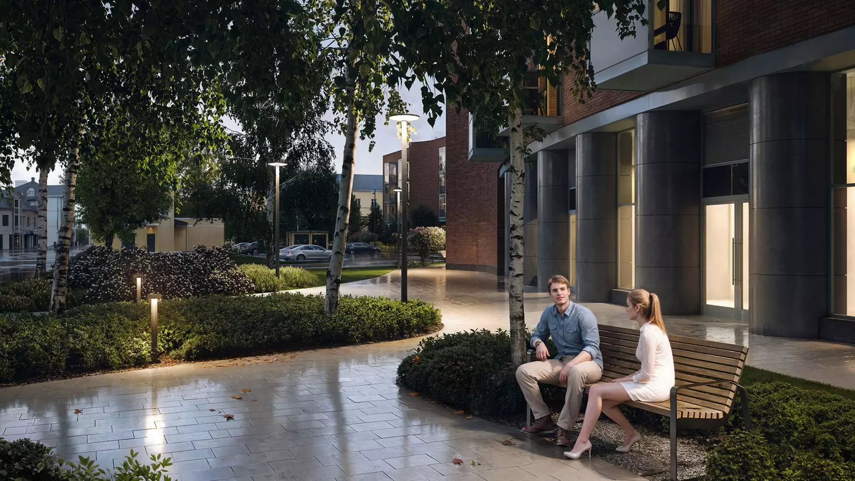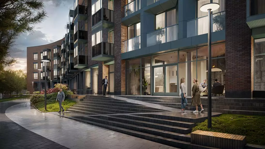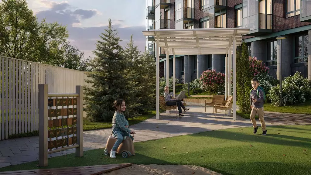 Приватная территория новостройки полностью закрыта от посторонних: гости смогут пройти в комплекс только через парадное лобби с консьержем. Ландшафтный дизайн двора разработан специалистами AFA Group и вдохновлён садами дворянских усадеб XIX века: во дворе будет много деревьев и цветов, появится деревянный амфитеатр для встреч и творчества, воздушная пергола с абажурами для уединённого общения, экологичные скамейки для чтения и созерцания природы. В вечернее время двор преобразит художественная подсветка. Для детей предусмотрена игровая площадка от Richter RUS с бревенчатыми лошадками, тоннелем-лазалкой и настоящим телескопом. Благоустроенный двор выведет к Жемчужному ручью с небольшим сквером у воды и променадом. Вдоль него, со стороны улицы на первом этаже сформируется торговый променад с магазинами и сервисами. Для кратковременной стоянки у главного входа оборудуют открытую парковку на 28 машино-мест. Также запланирован Wellness-центр для резидентов, вход в который будет доступен только через центральное лобби, включающий:
